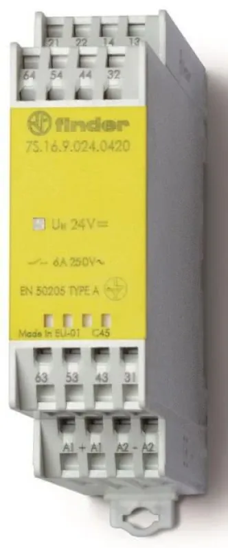 Das Finder 7S.16.9.024.5420 Relaismodul mit zwangsgeführten Kontakten bietet höchste Sicherheit und Zuverlässigkeit für industrielle Steuerungen, Maschinenbau und Bahntechnik. Entwickelt für anspruchsvolle Sicherheits- und Steuerungskreise, überzeugt das Relais durch robuste Technik, kompaktes Design und geprüfte Performance nach internationalen Normen.