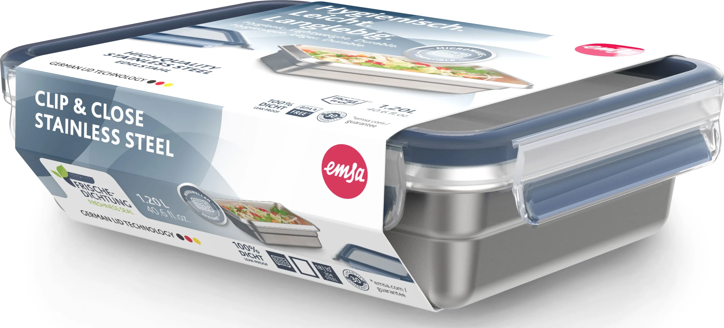 Entdecken Sie die perfekte Lösung für die hygienische und nachhaltige Aufbewahrung Ihrer Lebensmittel: Die auslaufsichere EMSA Clip & Close Frischhaltedose aus hochwertigem Edelstahl mit 1,2 Liter Fassungsvermögen. Dank innovativer Clip-&-Close-Frischedichtung bewahrt diese Aufbewahrungsbox Ihre Speisen zuverlässig frisch – ob zuhause, im Kühlschrank, zum Einfrieren oder unterwegs.