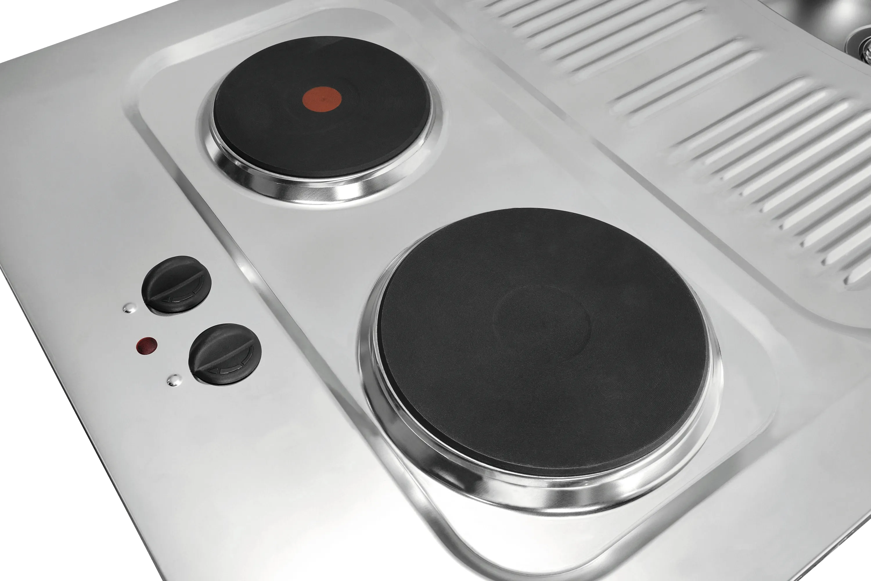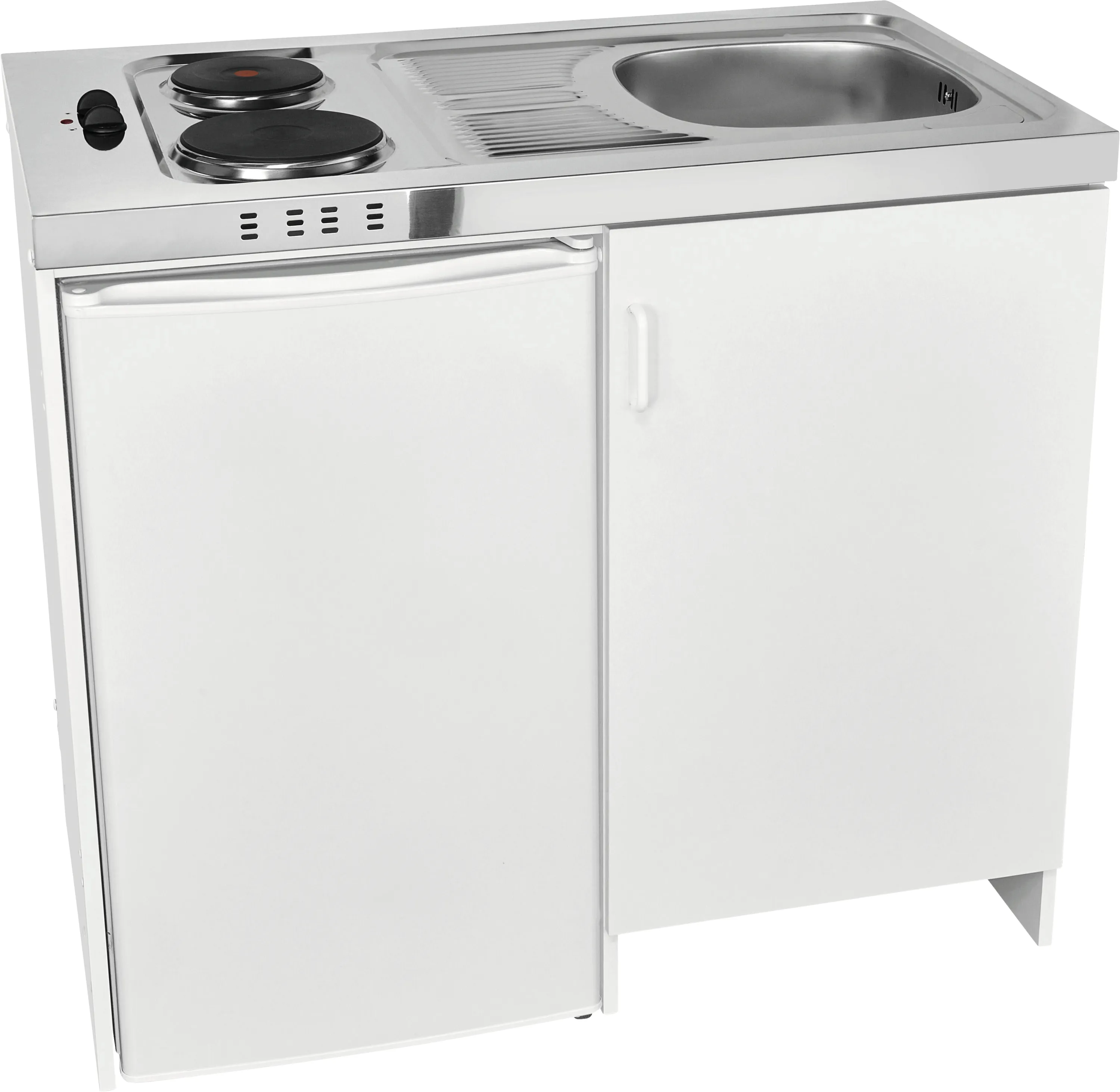 Dank ihres durchdachten All-in-one-Designs verwandeln Sie jede Nische in eine vollwertige Küchenzeile. Die Kombination aus Kühlschrank, Duo-Masse-Kochfeld und Edelstahl-Spüle sorgt für maximale Funktionalität auf kleinstem Raum. Hochwertige Materialien wie Edelstahl und Melamin garantieren Langlebigkeit und eine moderne Optik in Weiß mit Edelstahl-Akzenten, die sich harmonisch in jeden Wohnstil einfügt.
