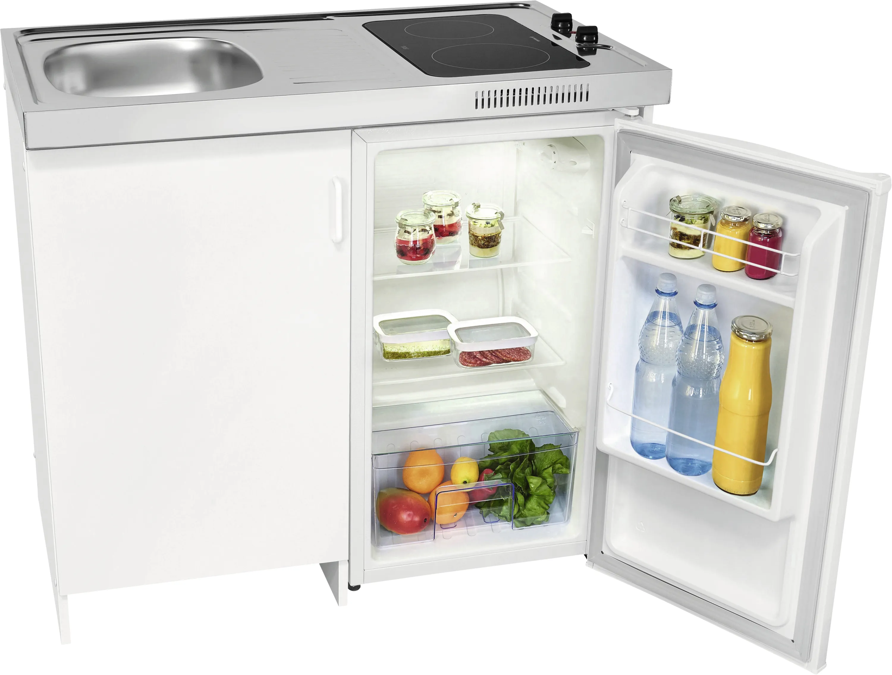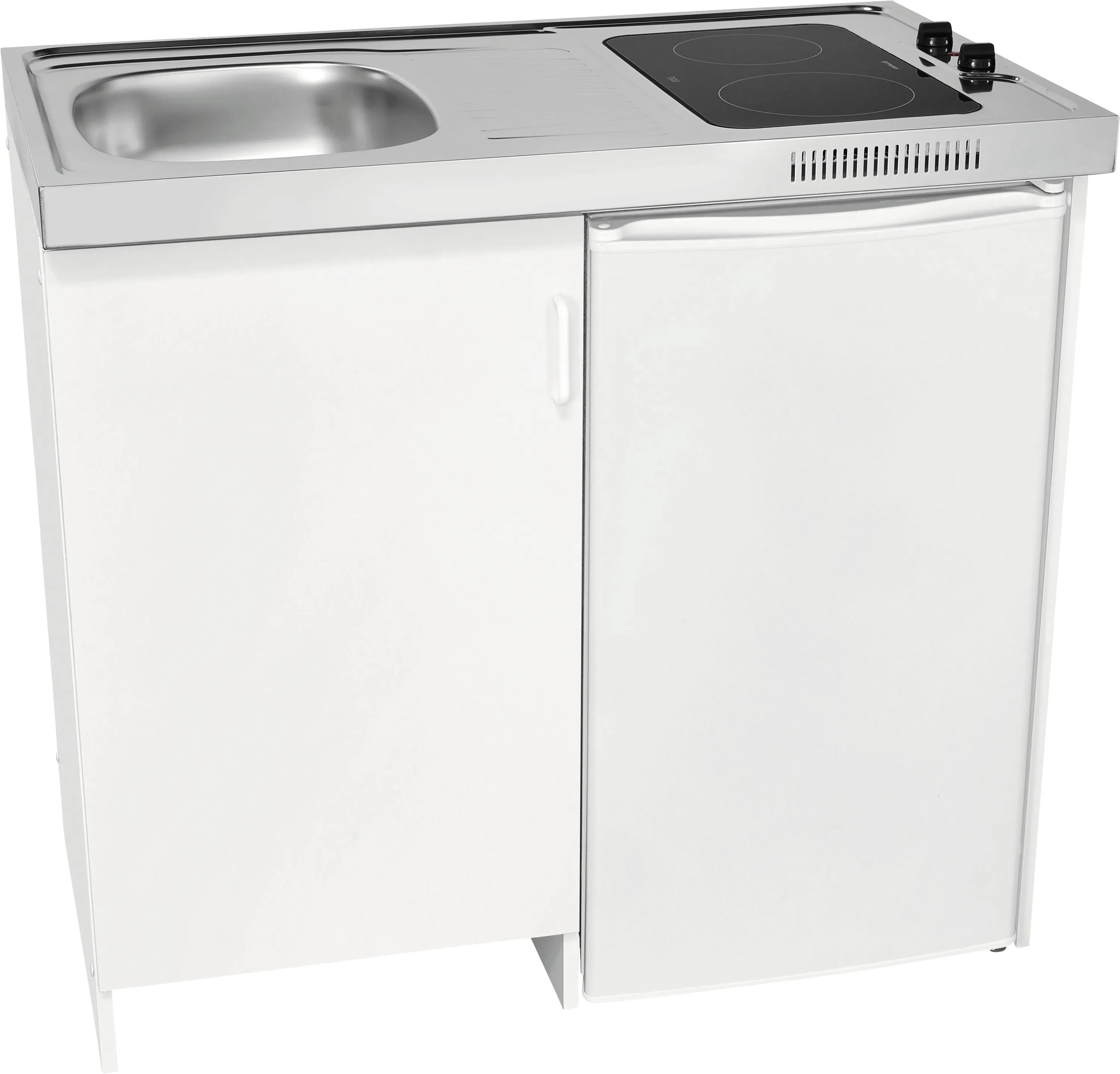 Mit nur 100 cm Breite passt diese hochwertige Pantryküche selbst in schmale Küchenzeilen oder Nischen. Das Glaskeramik-Kochfeld mit zwei Kochzonen, das integrierte Spülbecken und der geräumige Kühlschrank machen die Küchenzeile zur All-in-One-Lösung für Singles, Studenten oder kleine Haushalte.