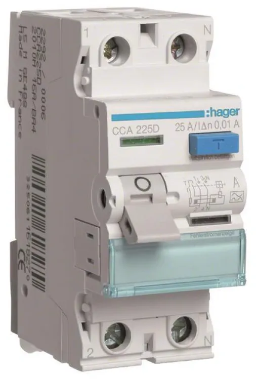 Hager FI-Schutzschalter CCA225D, Fehlerstromschutzschalter 2-polig 25A 10mA Typ A, 6kA