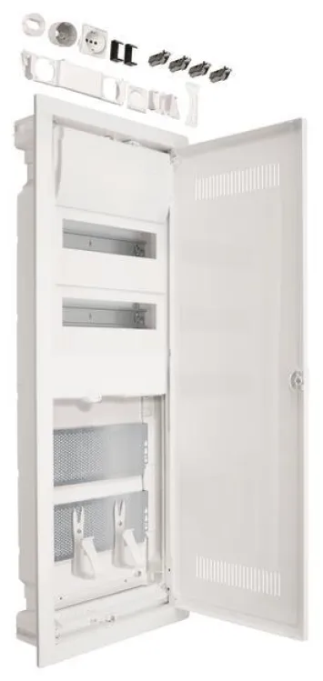 Weitere praktische Details wie die selbstständig zurückklappende Griffmulde, der einfach wechselbare Türanschlag (rechts oder links, ohne Rahmendemontage) und der großzügige Montagerauraum machen die Handhabung besonders komfortabel. Der Verteiler eignet sich optimal für Wohnungen, Einfamilienhäuser, Büros oder Kleingewerbe und erfüllt höchste Ansprüche an eine moderne Elektroverteilung.