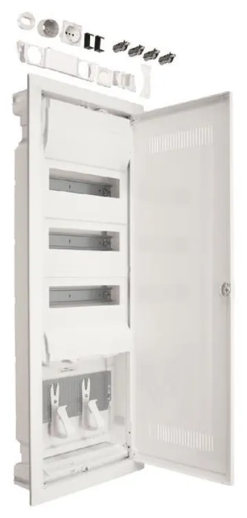 Die innovative Kunststofftür mit Belüftungsschlitzen ermöglicht eine bessere Ausbreitung von Funksignalen und sorgt so für stabile Verbindungen im gesamten Gebäude. Drei Gerätereihen mit insgesamt 36 + 6 Teilungseinheiten (PLE) bieten ausreichend Platz für Sicherungsautomaten, Multimedia-Module und weiteres Zubehör. Eine integrierte Steckdose und eine großzügige Montageplatte sind bereits enthalten.