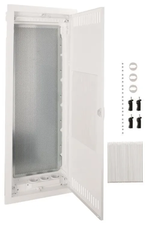 Das robuste Gehäuse aus schutzisoliertem Kunststoff (weiß, RAL 9010) mit frontbündiger, pulverbeschichteter Stahlblechtür fügt sich dezent in jede Hohlwand ein. Mit fünf Reihen und großzügigen Abmessungen (348 x 880,5 mm) bietet der Verteiler ausreichend Platz für aktive und passive Komponenten – von Patchmodulen bis zu Netzwerkverteilern. Die durchgehend gelochte Montageplatte aus verzinktem Stahlblech ermöglicht eine flexible und einfache Befestigung verschiedenster Geräte.