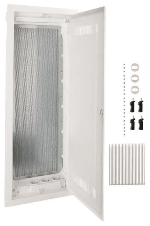 Die durchdachte Konstruktion vereint Sicherheit, Komfort und Flexibilität. Die geschlitzte Kunststofftür gewährleistet eine effektive Belüftung und unterstützt eine stabile WLAN-Signalqualität im gesamten Haus. Mit fünf Reihen und jeweils 12 Teilungseinheiten bietet der Verteiler großzügigen Platz für Homeway- und VDI-Komponenten.