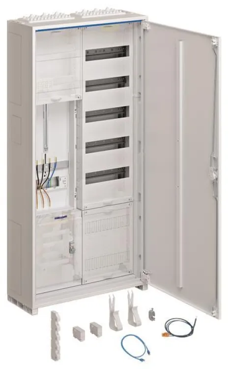 Ob für private Haushalte mit maximal 63A, als zentrale Energieverteilung in kleineren Mehrfamilienhäusern oder für anspruchsvolle Dauerstromanwendungen – dieser Komplettschrank erfüllt jegliche technischen Anforderungen. Besonders praktisch: Leitungseinführungen oben und unten, werkzeuglose Sammelschienendurchführungen sowie viel Platz für Modultechnik vereinfachen die Installation und sparen Zeit.