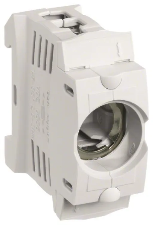 Kunststoff-Sicherungssockel D02 E18 63A 1polig Hutschiene Käfigklemme Abdeckung. D02-Sicherungsunterteil mit Abdeckung für Hutschienenmontage. Geeignet für Sicherungseinsätze und Hülsen-Pass Einsätze.