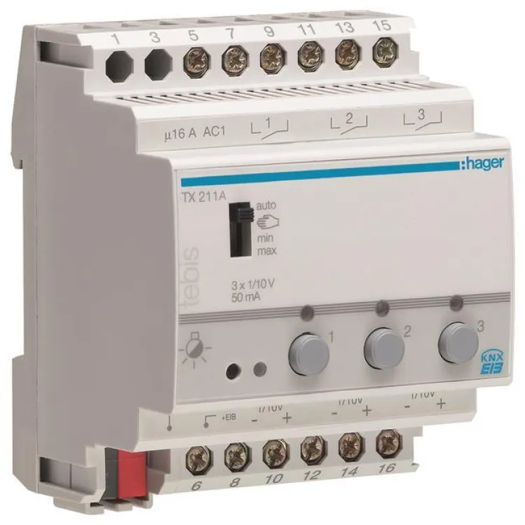 Der Hager TX211A Schalt-/Dimmaktor 3-fach KNX 1-10V ermöglicht die präzise Steuerung von Beleuchtung in modernen KNX-Gebäudesystemen. Mit drei unabhängigen Steuerausgängen (1-10V) und drei potenzialfreien Schaltausgängen kombiniert dieses Gerät zuverlässige Dimmfunktionen mit hoher Flexibilität – ideal für Smart Homes, Büros und gewerbliche Anwendungen.
