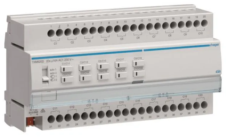 Der Hager Schalt-/Jalousieausgang KNX 20/10-fach TXM620D ist die professionelle Lösung für intelligente Haus- und Gebäudeautomation im KNX-System. Mit diesem leistungsstarken Reiheneinbaugerät steuern Sie bis zu 20 unabhängige Lasten oder 10 Rollladen- bzw. Jalousieantriebe – ideal für moderne Wohn- und Zweckbauten.