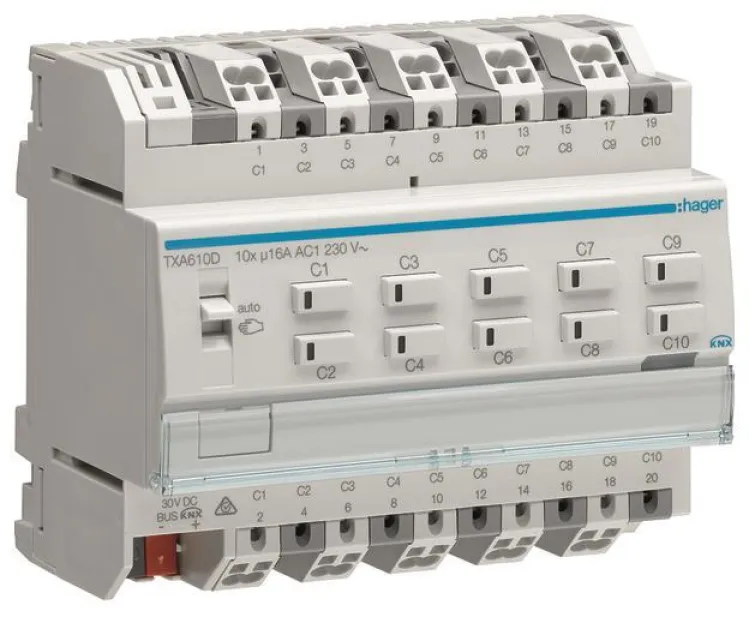 Mit dem Hager TXA610D realisieren Sie exakte Beleuchtungs-, Zentralschalt- und Jalousiefunktionen. Bis zu 64 Szenen je Kanal, prozentgenaue Lamellenverstellung und einfache Statusabfrage bieten Ihnen volle Kontrolle und smarte Freiheit. Die intelligente Automatisierung sorgt für optimales Raumklima und hilft, den Energieverbrauch nachhaltig zu senken.