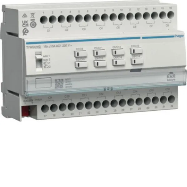 Der HAGER TYMS616D Schalt-/Jalousieaktor KNX Secure ist die ideale Lösung für moderne KNX Smart Homes und professionelle Gebäudeautomation. Mit bis zu 16 Schaltausgängen oder 8 Jalousiekanälen steuern Sie flexibel Beleuchtung, Jalousien, Rollläden und weitere Verbraucher – sowohl im privaten als auch im gewerblichen Bereich.