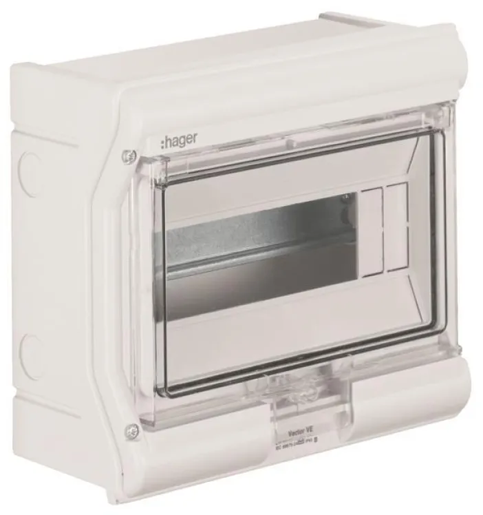 Mit 10 Teilungseinheiten und einer Reihe bietet der HAGER Vector Kleinverteiler ausreichend Platz für Ihre Einbaugeräte. Die Montage erfolgt einfach und schnell als Aufputz-Variante. Dank der verzinkten Hutprofilschiene (DIN 43 880) können Geräte bis 63A und mit 70 bzw. 85 mm Einbautiefe problemlos integriert werden.
