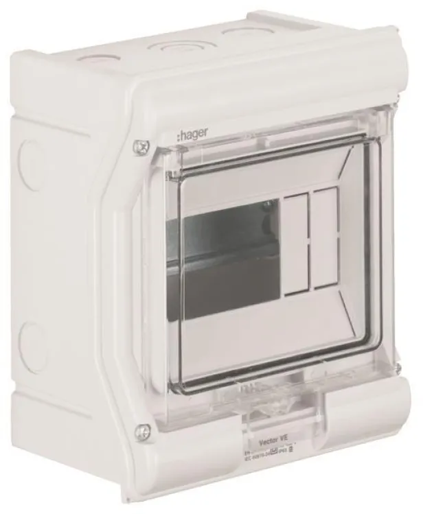 Der HAGER VE106PN Kleinverteiler Vector ist die optimale Lösung für sichere und langlebige Elektroinstallationen im Innen- und Außenbereich. Mit seinem kompakten Format (1x6TE) und der Schutzart IP65 schützt dieser Aufputz-Verteiler Ihre elektrischen Komponenten zuverlässig vor Staub, Feuchtigkeit und mechanischen Einwirkungen. Das robuste Gehäuse aus schlagfestem, UV-beständigem Polycarbonat (RAL 7035, lichtgrau) sorgt für eine hohe Lebensdauer – auch bei direkter Sonneneinstrahlung oder in anspruchsvollen Umgebungen.