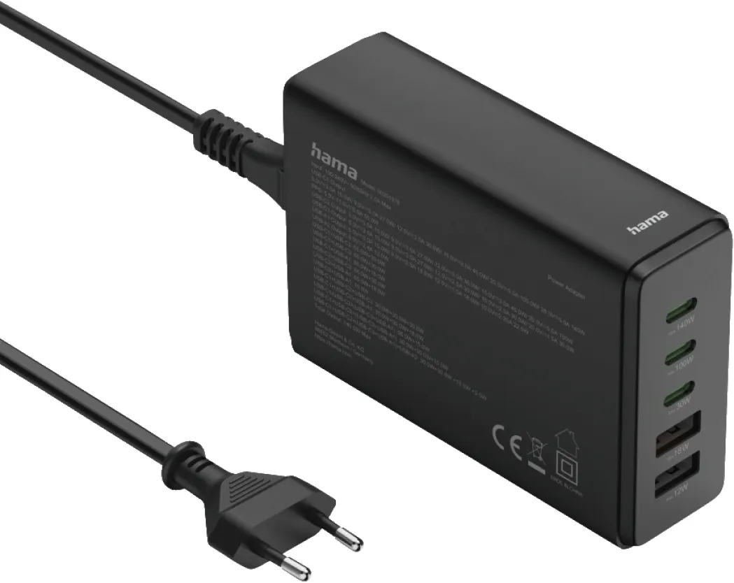 Die Hama 5-Fach USB GaN Ladestation 140W bringt volle Ladeleistung und modernste Technologie auf deinen Schreibtisch oder Nachttisch. Mit kompaktem Design in elegantem Schwarz und kraftvollen 140 Watt kannst du bis zu fünf Geräte gleichzeitig blitzschnell laden – perfekt für Alltag, Büro und unterwegs.