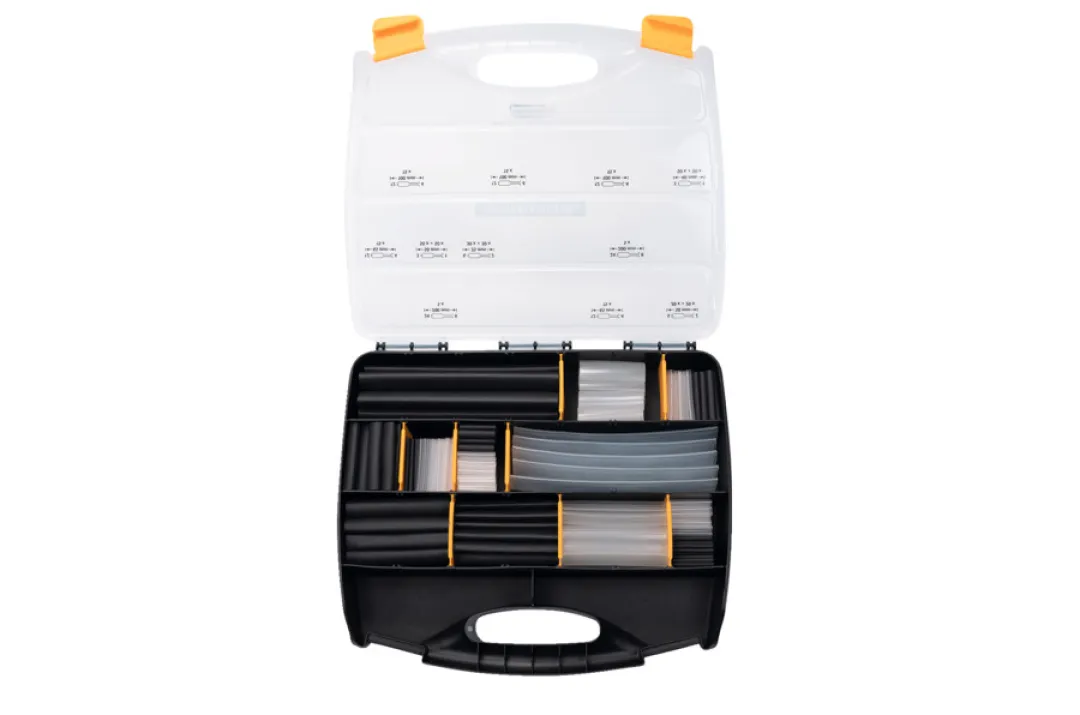 Entdecken Sie das vielseitige HELLERMANN ShrinKit 321-A Schrumpfschlauchset 3:1 mit Kleber – die intelligente Wahl für alle, die Wert auf professionelle Kabelisolierung, Feuchtigkeitsschutz und zuverlässige Elektroinstallationen legen. Das umfangreiche Kit im praktischen Sortimentskoffer bietet 385 dünnwandige Schrumpfschlauch-Abschnitte in 4 Größen, jeweils in Schwarz und Transparent, und deckt damit ein breites Anwendungsspektrum ab.