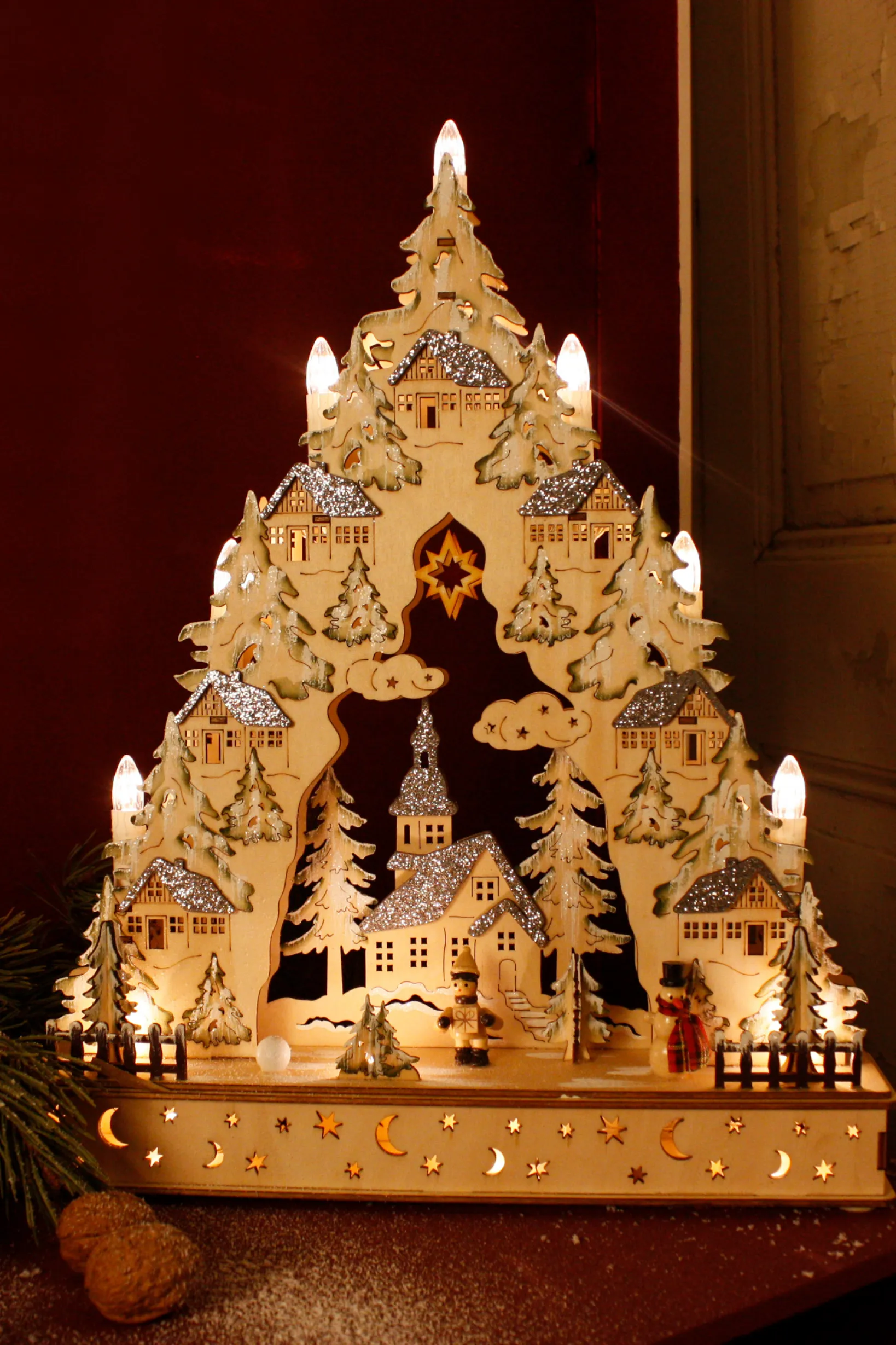 Ob als festliches Highlight auf der Fensterbank, als stimmungsvoller Mittelpunkt auf Ihrer Kommode oder liebevolles Geschenk für Freunde und Familie – dieser LED Schwibbogen bereichert jedes Zuhause in der Winterzeit. Die batteriebetriebene Funktion macht Sie unabhängig von Steckdosen und erlaubt freie Platzwahl in jedem Raum. Dank des detailreichen, winterlichen Dorfdorfs zieht der Holzleuchter alle Blicke auf sich und lädt zum Träumen ein – ein echtes Stück Weihnachtszauber aus Sachsen für Ihre vier Wände!