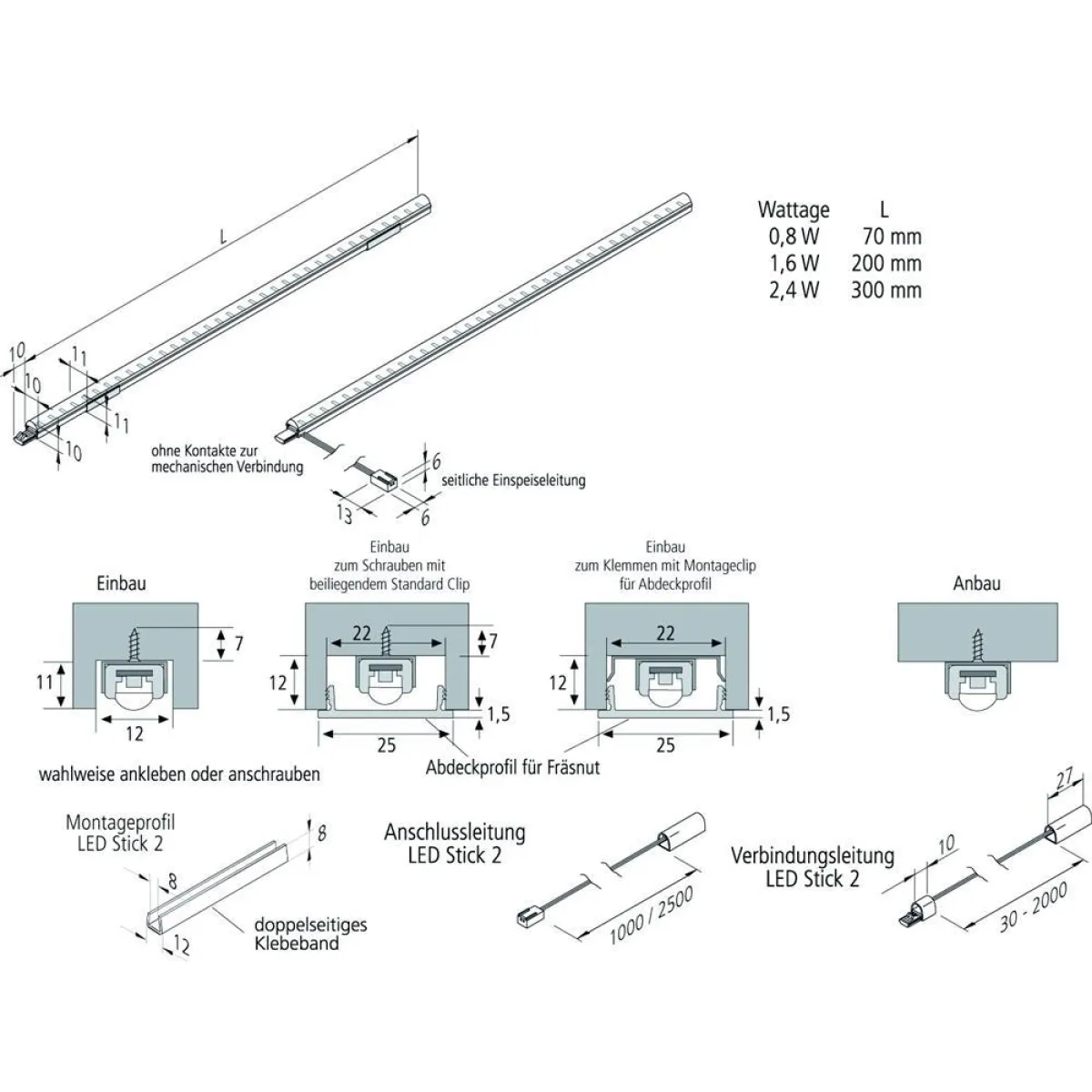 Mit optionalem Zubehör wie dimmbarem Trafo, Funkschalter oder Einbauprofilen können Sie Ihr Lichtkonzept individuell gestalten. Die Verbindung mehrerer Sticks ermöglicht ein durchgehendes Lichtband – ideal für anspruchsvolle Beleuchtungsdesigns.