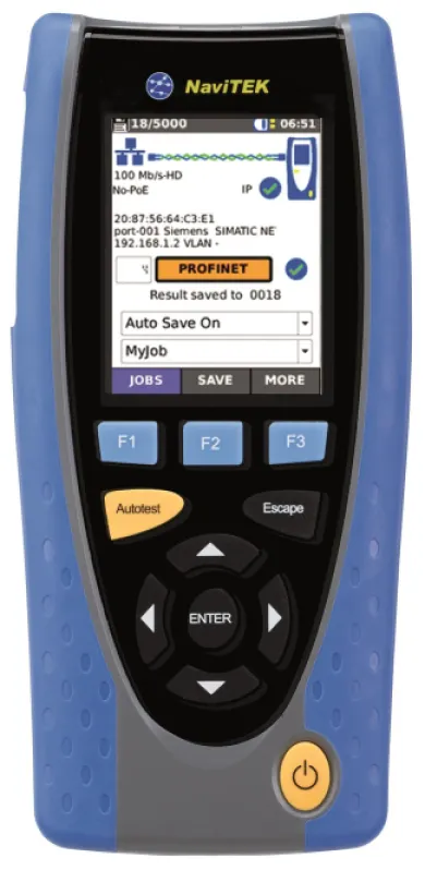 NaviTEK IE PROFINET-Tester zur Inbetriebnahme, Wartung und Fehlerdiagnose für Industrial-Ethernet PROFINET-Netzwerke sowie Ethernet-IP-Standardnetzwerke. Ermittelt die Konfigurationen von Netzwerken und Geräten sowie mögliche Fehlerstellen und Verdrahtungspläne. Überprüft den Status des Netzwerkes mit Ampelfarben, zeigt alle Knotenparameter des Netzwerkes, wie IP-Adresse, Anbieter, Softwareversion an. NETMAP-Funktion scannt das gesamte Netzwerk zur Erkennung von Änderungen und das bis zu 48 Stunden-Ereignisprotokoll hilft beim Auffinden von falsch konfigurierten Geräten. Testet M12-PROFINET Kupferkabeln D- oder X-kodiert und Glasfaserkabeln über SFP-Module (optional). Generiert automatisch Testberichte im PDF- oder CSV-Format mit Firmenlogo und Firmenangaben. Standortunabhängige Übermittlung der Testberichte mit der kostenlosen IDEAL App AnyWARE. Darüber hinaus unterstützt der kompakte Tester umfassende Test- und Diagnosefunktionen wie IPv4, IPv6, PoE/PoE+-Erkennung, Ping- und Traceroute-Test, DHCP-Client, HUB-Blink, Switch-Erkennung 10/100/1000 Mbit/s, Tongenerator, Netzwerk-Scanner-Anzeige, Port-Identifikation mit EDP/CDP/LLDP-Protokollen.