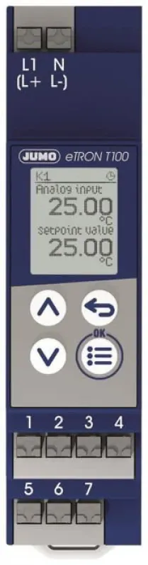 Dank kompakter Bauweise (90 × 22,5 mm) und Hutschienenmontage (35 mm) lässt sich der Thermostat auch in beengten Schaltschränken schnell und sicher installieren. Die Bedienung erfolgt komfortabel über vier intuitiv angeordnete Tasten an der Front. Alle relevanten Werte werden auf einer hintergrundbeleuchteten Dotmatrix-Anzeige mit Symbolen für °C und °F klar dargestellt – für optimale Ablesbarkeit, selbst bei schlechten Lichtverhältnissen.