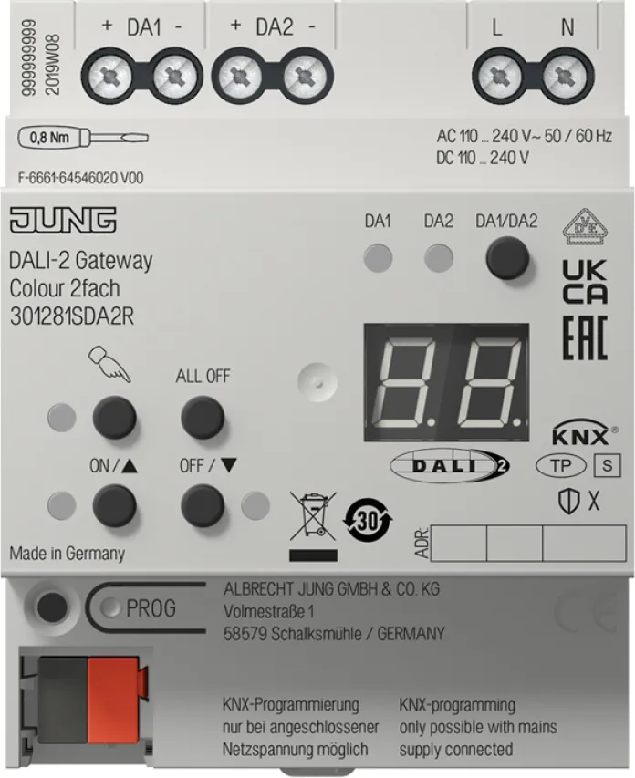 Ob für effektive Arbeitsplätze, stimmungsvolle Gastronomie oder flexible Szenen im Smart Home – mit dem JUNG KNX DALI-2 Gateway Colour 2fach realisieren Sie moderne Lichtautomation professionell und energiesparend. Umfangreiche Rückmeldungen wie Helligkeit und Status sorgen für maximale Transparenz und Kontrolle.