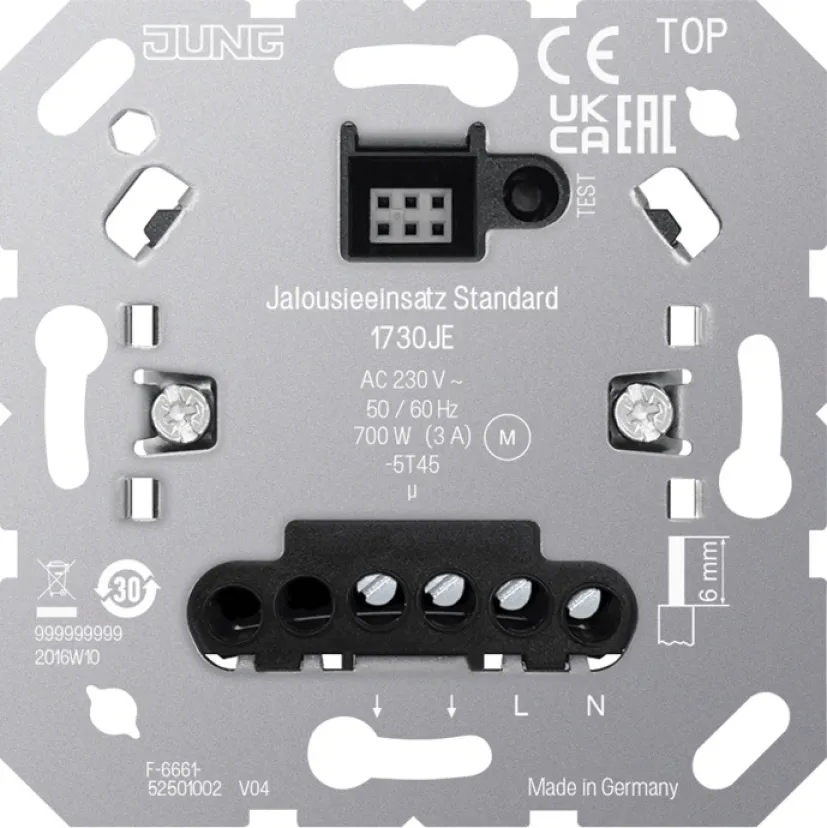 Der Jung Jalousieeinsatz Standard 1730JE ermöglicht Ihnen die komfortable und effiziente Steuerung von Jalousien, Rollläden und Markisen – ganz nach Ihren Wünschen, automatisch per Timer oder manuell per Tastendruck. Dank moderner Technik und flexibler Funktionen sorgt dieser Unterputz-Einsatz für zuverlässigen Sonnenschutz und ein angenehmes Raumklima – im privaten Zuhause ebenso wie im gewerblichen Objekt.