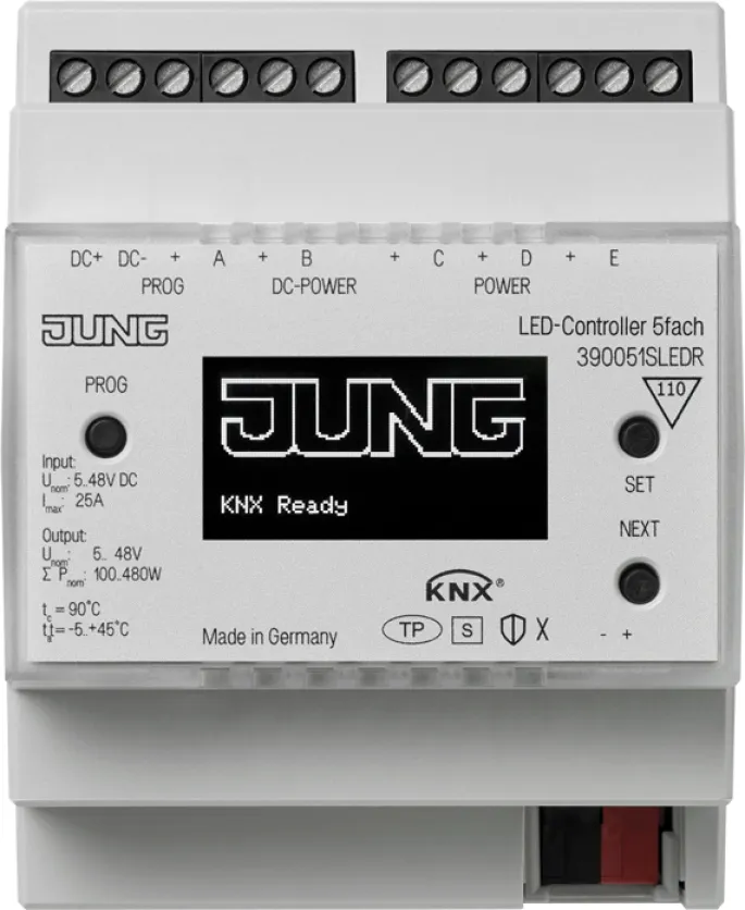 Der JUNG 39005 1S LED R Dimmaktor KNX ist die smarte Lösung für moderne Lichtsteuerung in Wohn- und Gewerbeobjekten. Als leistungsstarker KNX LED-Controller mit fünf individuell konfigurierbaren Ausgängen ermöglicht er präzises Dimmen und Schalten von LEDs, LED-Modulen, Spots sowie Halogen- und Glühlampen im Spannungsbereich von 5 bis 48 V/DC. So realisieren Sie flexible Lichtszenarien – energieeffizient, komfortabel und sicher.