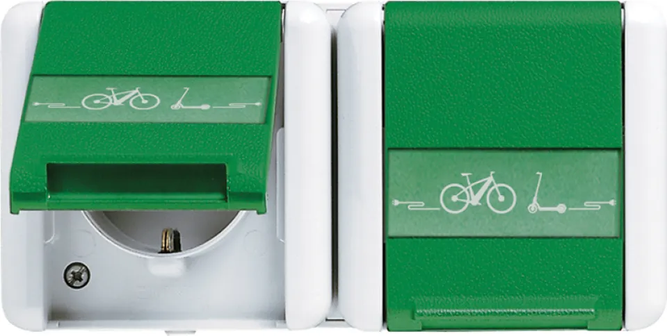 Die JUNG 8220 GN NAWEB Doppelsteckdose ist die optimale Lösung für alle, die eine wetterfeste, robuste und sichere Außensteckdose speziell zum Laden von E-Bikes suchen. Mit ihrem E-Bike-Ladesymbol und großzügigen Beschriftungsfeldern eignet sie sich ideal für Carports, Garagen, Fahrradstellplätze oder den Garten. So schaffen Sie komfortable und sichere Lademöglichkeiten für E-Bikes und andere Elektrogeräte im Außenbereich.
