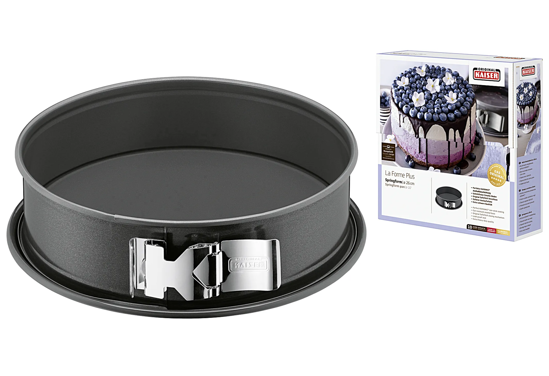 Erleben Sie Backgenuss auf höchstem Niveau: Mit der KAISER La Forme Plus Springform 28 cm gelingen Kuchen, Quiche und Torten nicht nur perfekt, sondern sehen dabei auch noch professionell aus. Die innovative Antihaftbeschichtung und der einzigartige SafeClick-Verschluss machen diese Backform zu einem Must-have für ambitionierte Backfans und Profis.