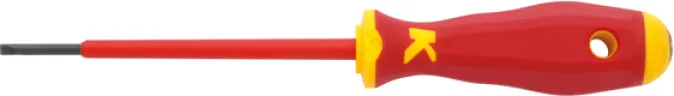 Setzen Sie auf höchste Präzision, Langlebigkeit und ergonomischen Komfort: Dieser VDE-Schlitz-Schraubendreher wurde speziell für Schlitzschrauben entwickelt und erfüllt alle Anforderungen für modernes, sicheres Arbeiten an spannungsführenden Teilen.