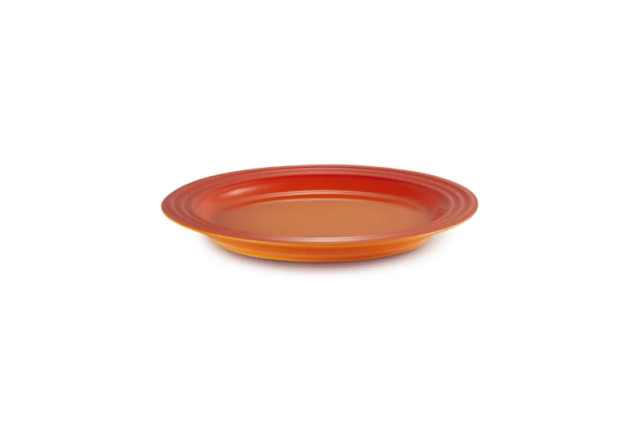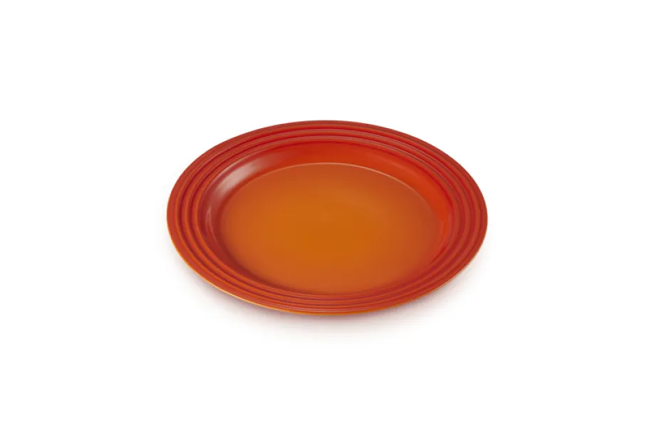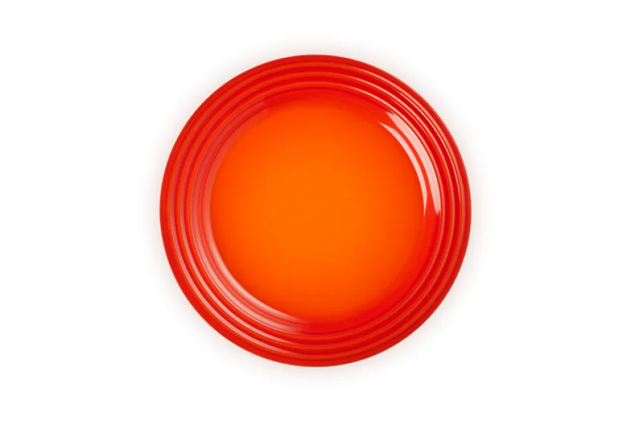 Mit seiner strahlenden Ofenrot-Farbe bringt der Frühstücksteller lebendige Akzente auf jeden Tisch. Dank hochwertigem glasierten Steinzeug ist der Teller nicht nur optisch ein echter Hingucker, sondern überzeugt auch durch seine robuste Verarbeitung und Langlebigkeit. Charakteristisch für Le Creuset ist das elegante, dreifache Ringrelief am Rand, das an das berühmte Gusseisen-Design erinnert und den Teller sofort als Original erkennbar macht.