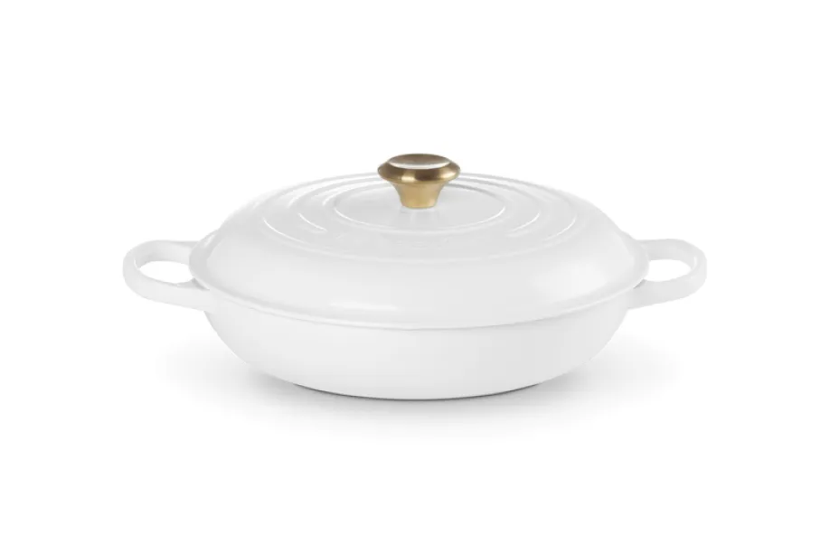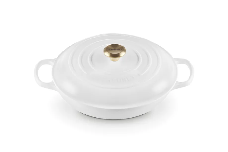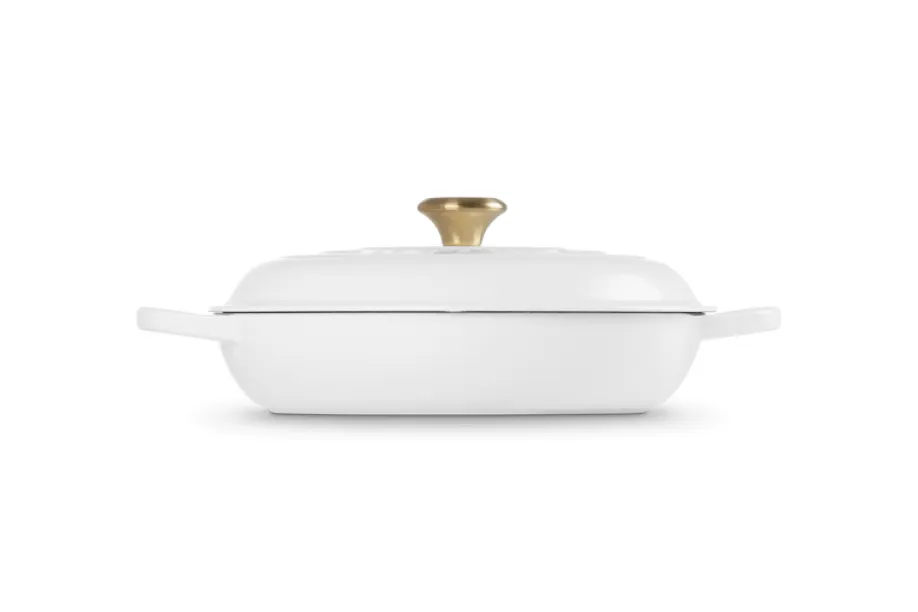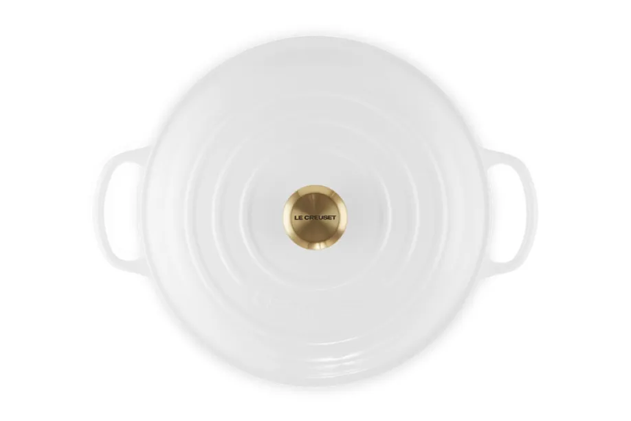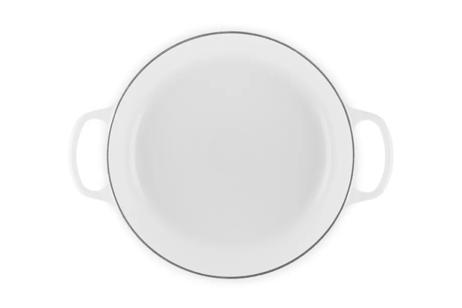 Das formschöne, edle weiße Finish sorgt für eine moderne Optik, während die massive Gusseisenkonstruktion für beste Kochergebnisse steht. Hobbyköche und Profis schätzen die gleichmäßige Hitzeverteilung, die saftiges Fleisch, zarte Schmorgerichte und aromatische Aufläufe garantiert. Der dicht schließende Deckel erhält alle Aromen und Feuchtigkeit, sodass Ihre Speisen besonders geschmackvoll bleiben.