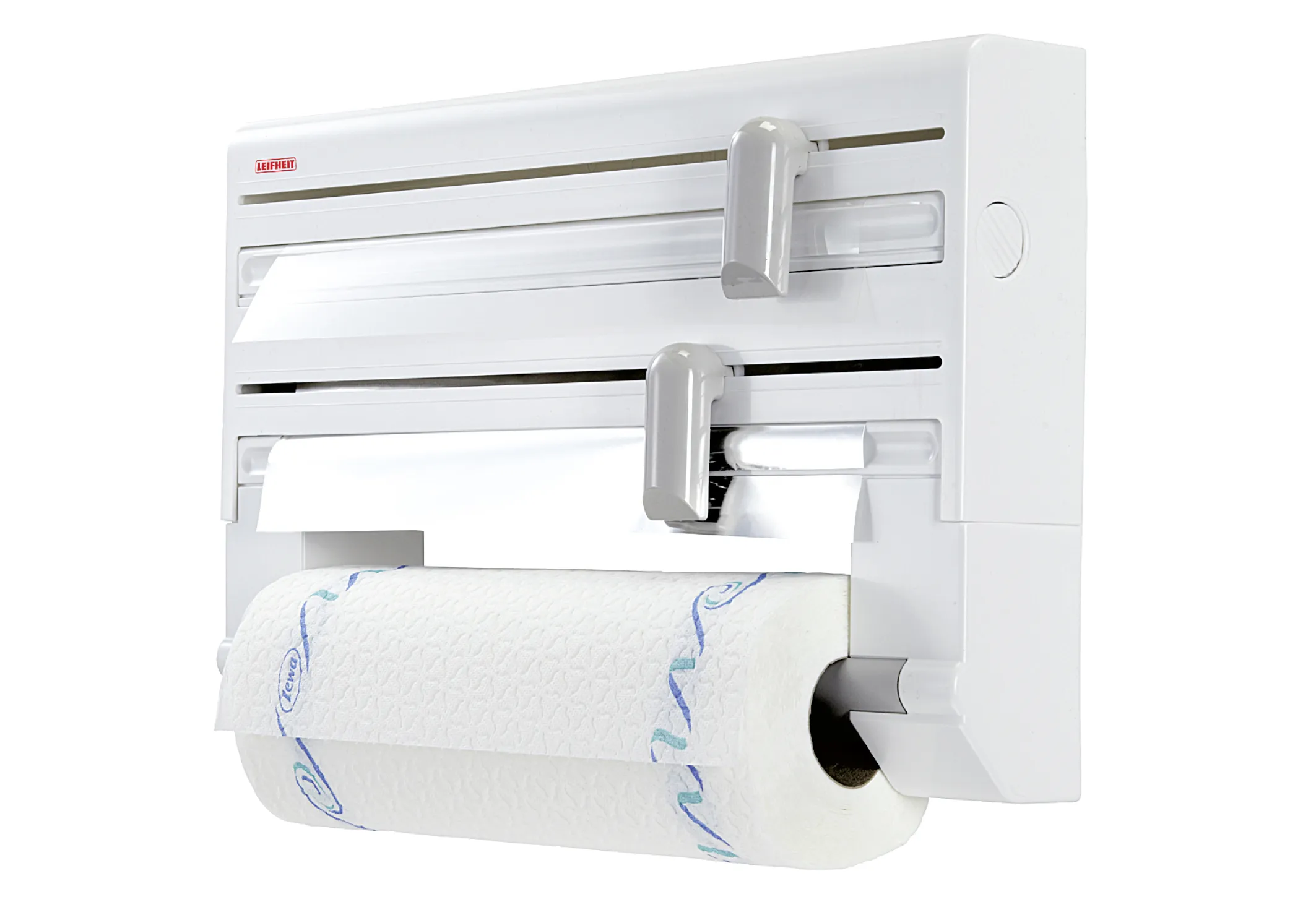 Dank des durchdachten Designs bleibt Ihre Arbeitsfläche frei und übersichtlich. Die hochwertigen Klingen sind sicher hinter den Schiebern verborgen und minimieren so das Risiko von Verletzungen. Dieser Wandrollenhalter richtet sich an alle, die Wert auf Ergonomie, Ordnung und langlebige Haushaltshelfer legen.