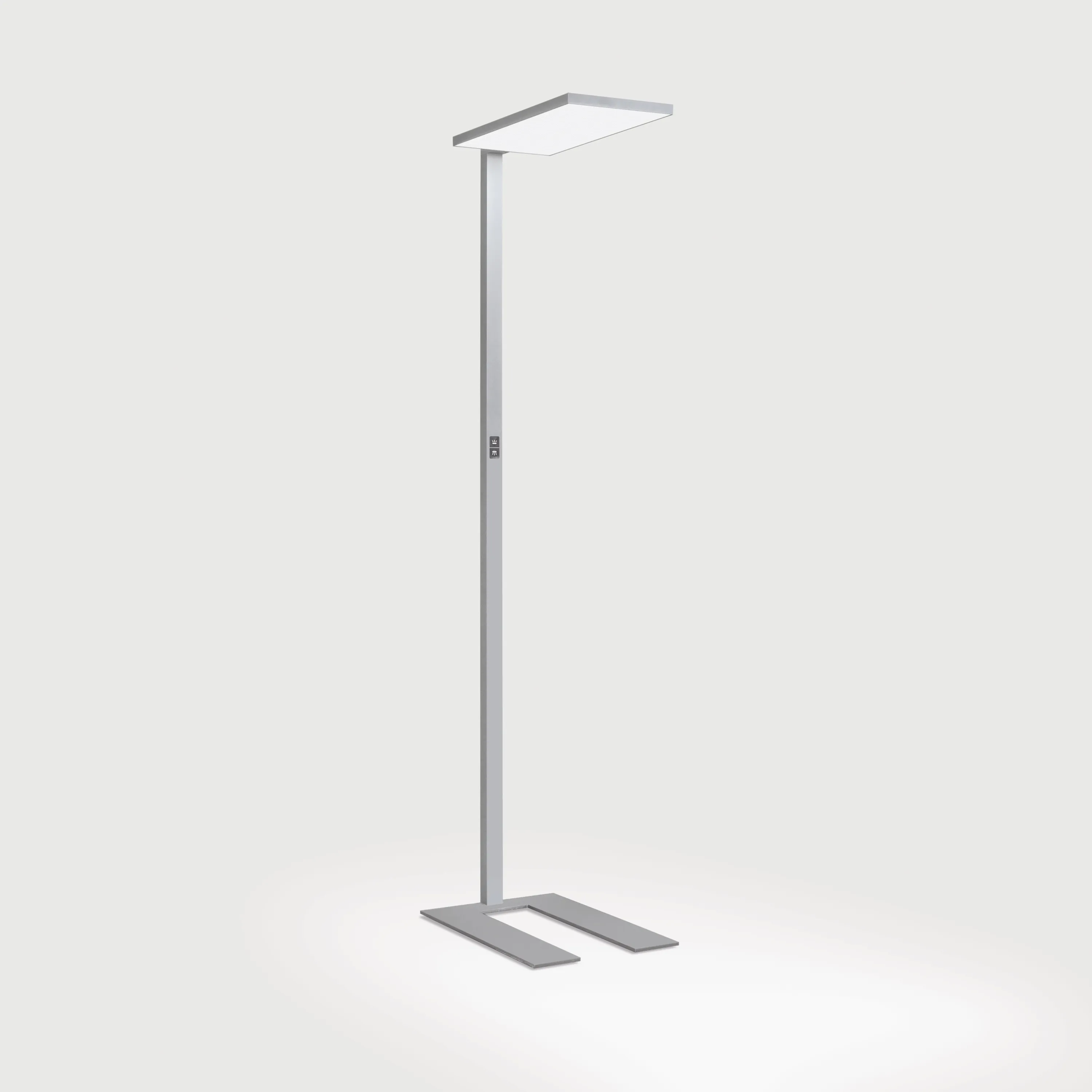 Cubic-F2. LED. Stehleuchte. Filigraner Leuchtenkopf mit 25mm minimalistischer Bauhöhe. Beleuchtungskörper aus hochwertigem Aluminiumprofil. Oberfläche Silver Anodised. Lichtcharakteristik: Direkt-/ indirektstrahlend. Farbtemperatur: 4000K (Cool White). Farbwiedergabeindex (Ra): >80. Microprismenoptik zur Reduktion der Leuchtdichte in Office-Bereichen. UGR<=19. Getrennt stufenlose Dimmung der Lichtkammern direkt/indirekt. LxBxH (Leuchtenkopf, rechteckig/Mast). L=600mm. B=300mm. H=2000/25mm. High-Power-Bestromung. 15300lm. 92W. 19,5kg. Binning initial <= MacAdam 3. U-förmige Fußplatte passend zur Leuchtenfarbe lackiert. Stecker Schutzkontakt CEE 7/7 (Type E+F). IP20. Schutzklasse I. CE-, UKCA Kennzeichnung. ENEC. IK02. 220-240V. 50-60 Hz. Lichtstromrückgang von max. 0,4%/1.000 Betriebsstunden. Nennausfallrate von max. 0,2%/1.000 Betriebsstunden. L80B10 (tq 25°C) = 50.000h. Hersteller: Lightnet GmbH, nach ISO 9001:2015 zertifiziert