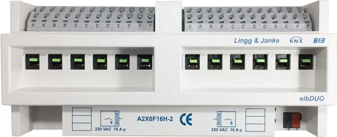 Der Lingg & Janke KNX Schaltaktor 12-fach A2X6F16H-2 ist die leistungsstarke und flexible Lösung für anspruchsvolle KNX-Installationen. Mit 12 unabhängig schaltbaren Ausgängen, 16A Bemessungsstrom pro Kanal und intuitiver Handbedienung erfüllt dieser Schaltaktor höchste Anforderungen im modernen Smart Building – ideal für Gewerbe, Büro und hochwertige Wohnprojekte.