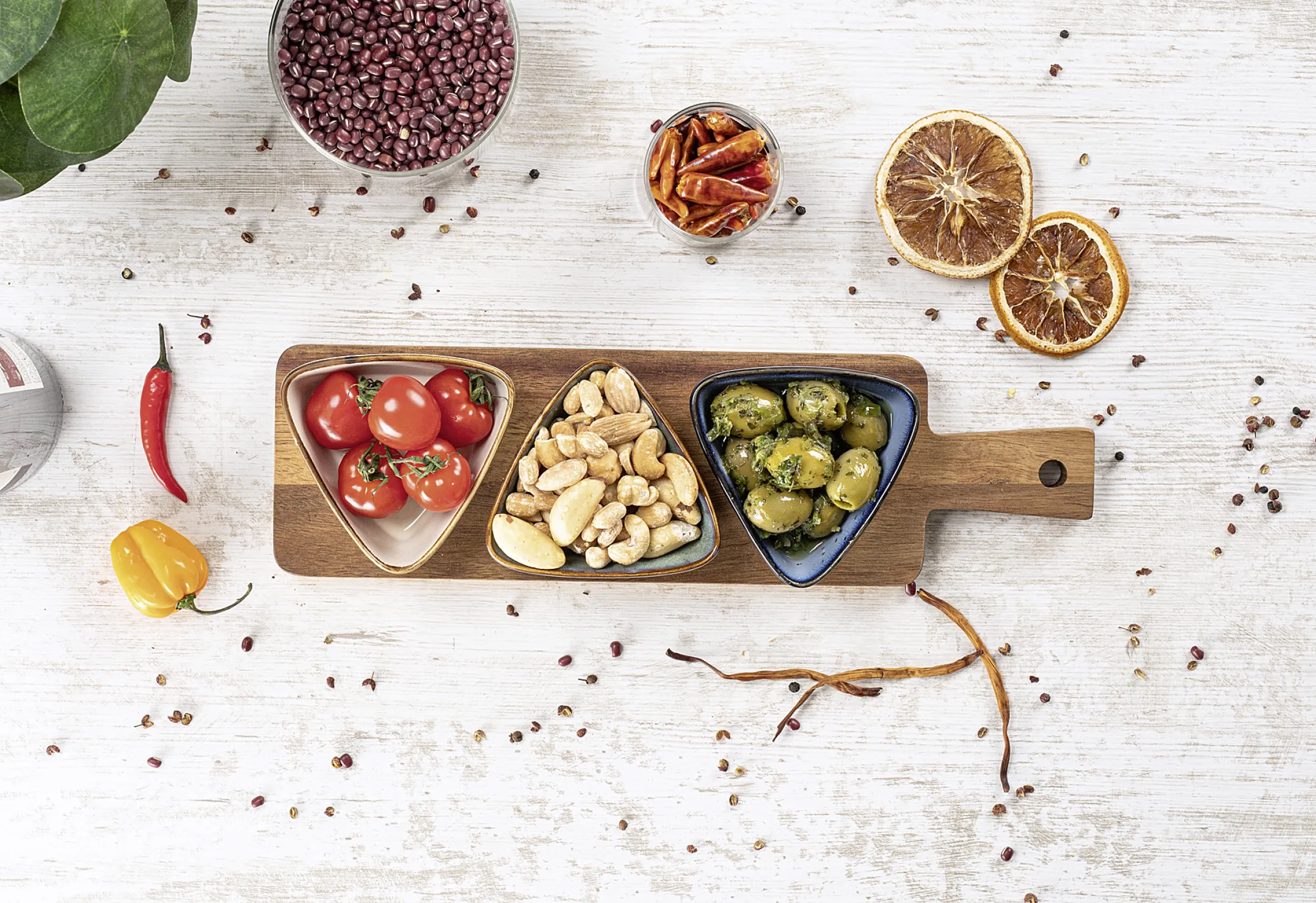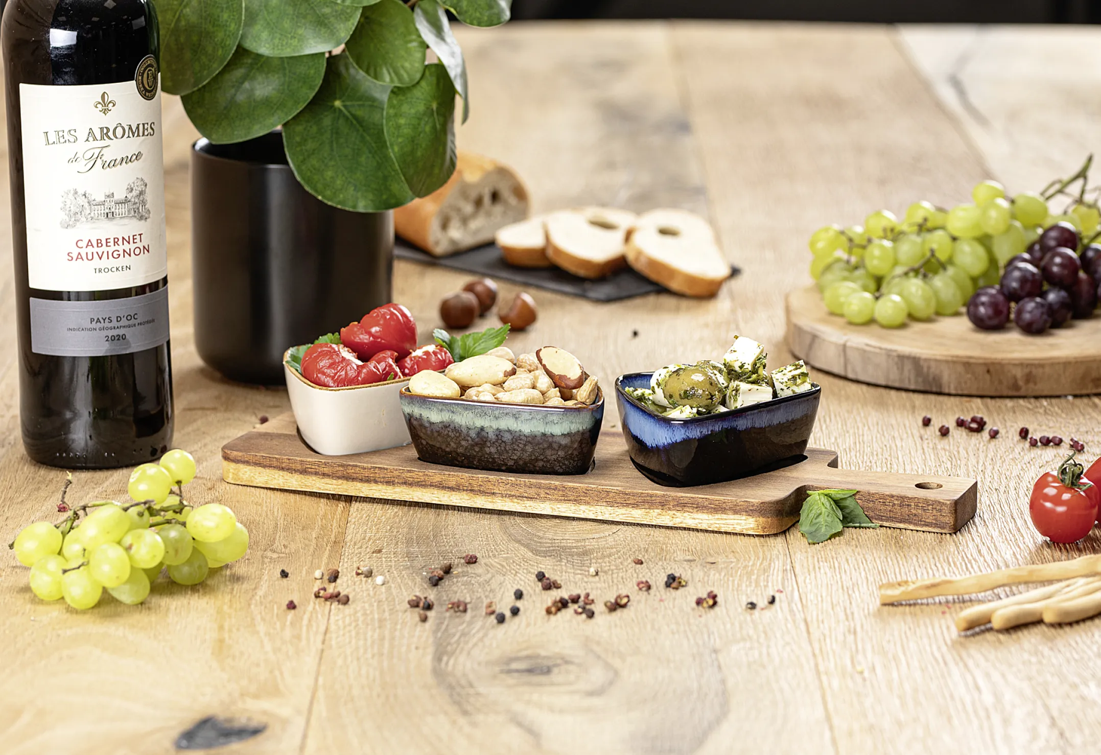 Verwandeln Sie Ihre Serviermomente in ein Erlebnis: Das Dipschalen-Set besteht aus einem FSC-zertifizierten, edlen Akazienholz-Brett sowie drei dreieckigen Schälchen aus stabilem Steinzeug. Egal ob knackige Gemüsesticks, raffinierte Dips, Saucen oder feine Snacks – dieses Ensemble setzt alles gekonnt in Szene und sorgt für einen stilvollen Hingucker auf jedem Tisch.