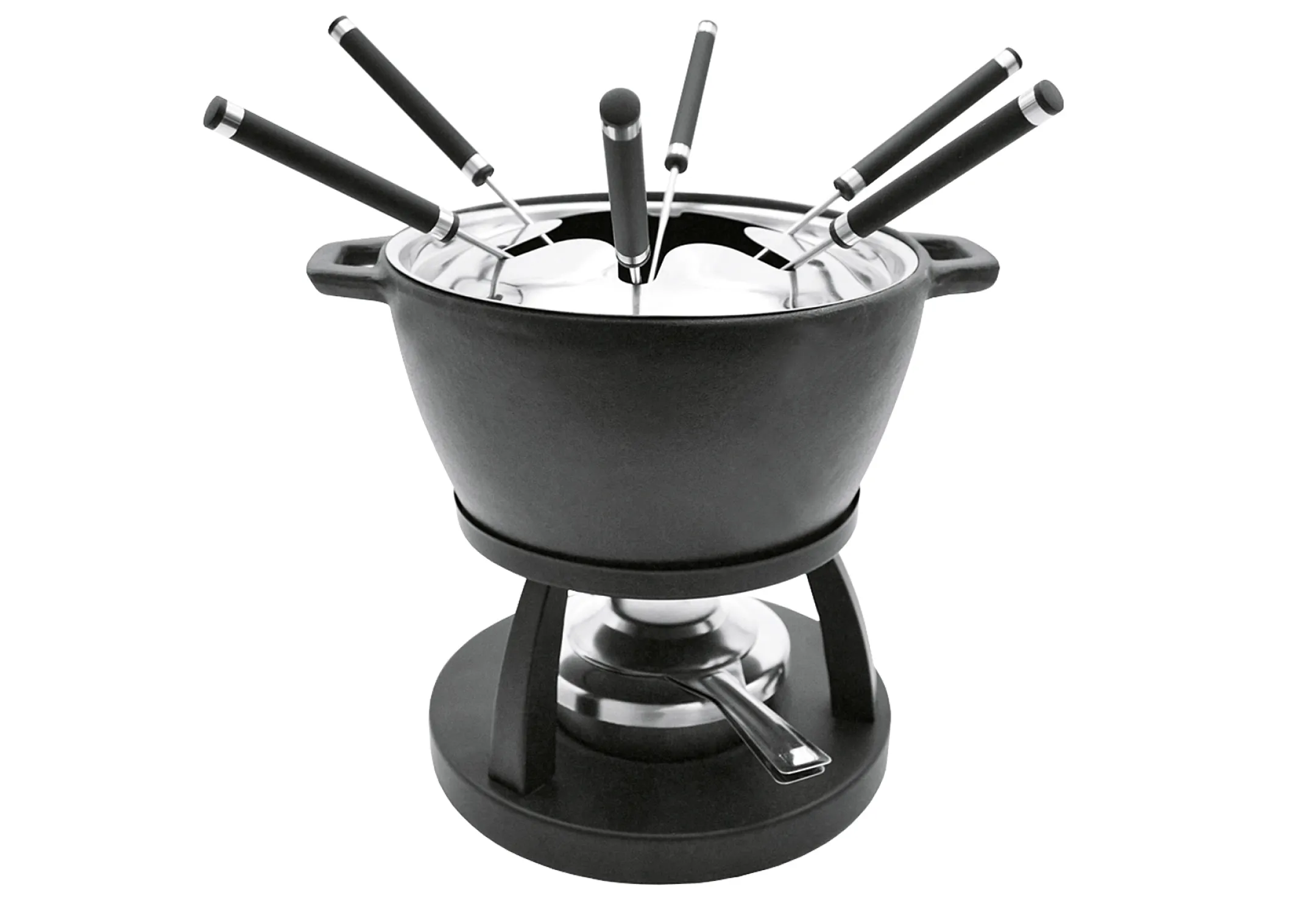 Das schwarze Fondueset begeistert durch einen modernen Look und überzeugt mit einer effektiven Wärmeverteilung dank robustem Gusseisen. Ob klassisches Fleisch-Fondue, zartes Käsefondue oder süßes Schokoladenfondue – das Set liefert die ideale Basis für jede Fondue-Variante und bleibt dabei lange warm, sodass jeder Gast in Ruhe genießen kann.