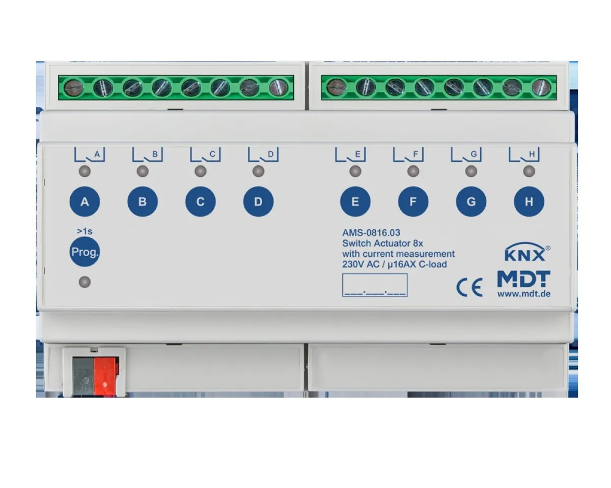 Der MDT AMS-0816.03 KNX Schaltaktor ist die optimale Lösung für professionelle KNX-Installationen in Wohn- und Zweckgebäuden. Mit acht unabhängig schaltbaren Ausgängen, einer hohen Schaltleistung von bis zu 16 A pro Kanal und integrierter True RMS Strommessung bietet dieser Schaltaktor maximale Flexibilität und Effizienz für Ihre Gebäudeautomation.