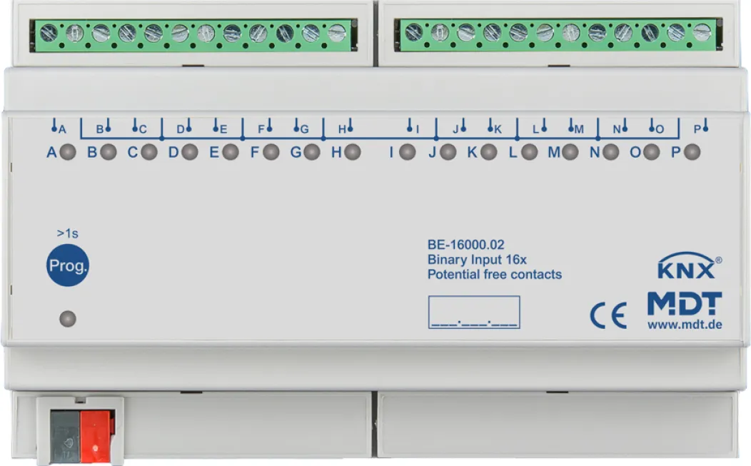 Der MDT BE-16000.02 KNX Binäreingang 16-fach ist ein kompaktes Reiheneinbaugerät für die flexible Erweiterung von KNX-Systemen. Mit 16 unabhängigen, potentialfreien Eingängen auf nur 8 Teilungseinheiten ermöglicht das Modul die Integration zahlreicher Taster, Schalter oder Kontakte – ideal für anspruchsvolle Gebäudeautomation in Wohn- und Zweckbauten.