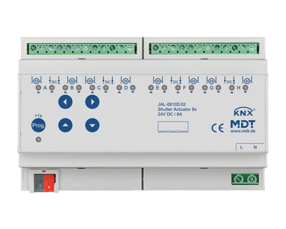 Steigern Sie den Komfort und die Energieeffizienz Ihrer KNX-Gebäudeautomation mit dem MDT JAL-0810D.02 Jalousieaktor 8-fach. Dieses kompakte Hutschienengerät steuert bis zu acht 24V-DC-Rollladen- oder Jalousiemotoren präzise und individuell – für optimalen Sonnen- und Sichtschutz in jedem Raum.