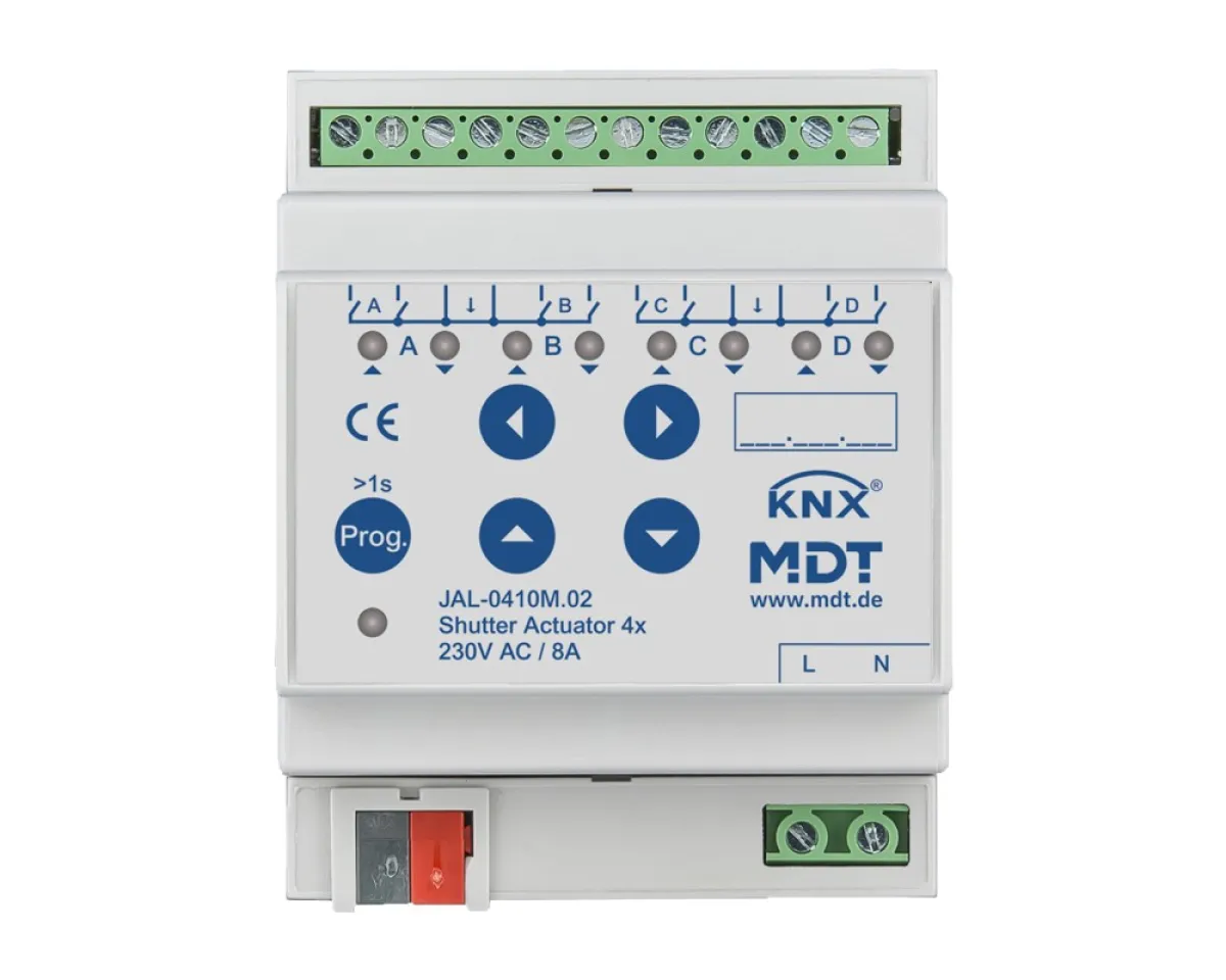 Der MDT JAL-0410M.02 KNX Jalousieaktor 4-fach mit Fahrzeitmessung bietet Ihnen intelligente und flexible Steuerungsmöglichkeiten für Jalousien und Rollläden in Smart Homes und gewerblichen Gebäuden. Mit präziser Fahrzeitmessung, automatischer Lamellennachführung und Sonnenstandsberechnung sorgt dieses KNX-Feldgerät für optimalen Sonnenschutz, mehr Komfort und erhöhte Energieeffizienz.