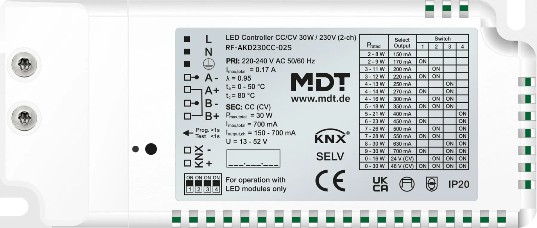 Der MDT RF-AKD230CC.02S KNX RF+ LED Controller ist die perfekte Lösung für moderne, flexible und energieeffiziente LED-Beleuchtung im Smart Home sowie in Gewerbe- und Wohngebäuden. Mit zwei Kanälen und bis zu 30 Watt Ausgangsleistung steuern Sie Ihre Lichtsysteme komfortabel, sicher und individuell – auch in bestehenden Objekten dank kabelloser KNX RF+ Funktechnologie.