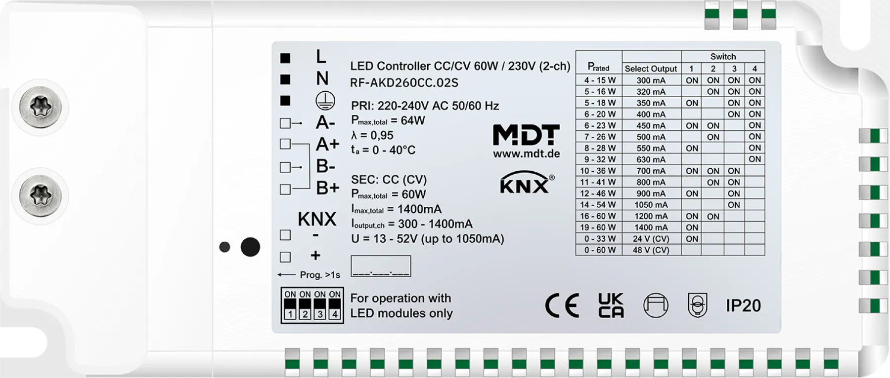 Mit dem MDT RF-AKD260CC.02S KNX RF+ LED Controller setzen Sie auf zukunftssichere LED-Steuerung, die sich nahtlos ins KNX-Ökosystem integriert. Ob für gemütliches Licht am Abend, konzentrierte Arbeitsumgebung oder dynamische Lichtkonzepte – Ihre Steuerungsmöglichkeiten sind nahezu grenzenlos.