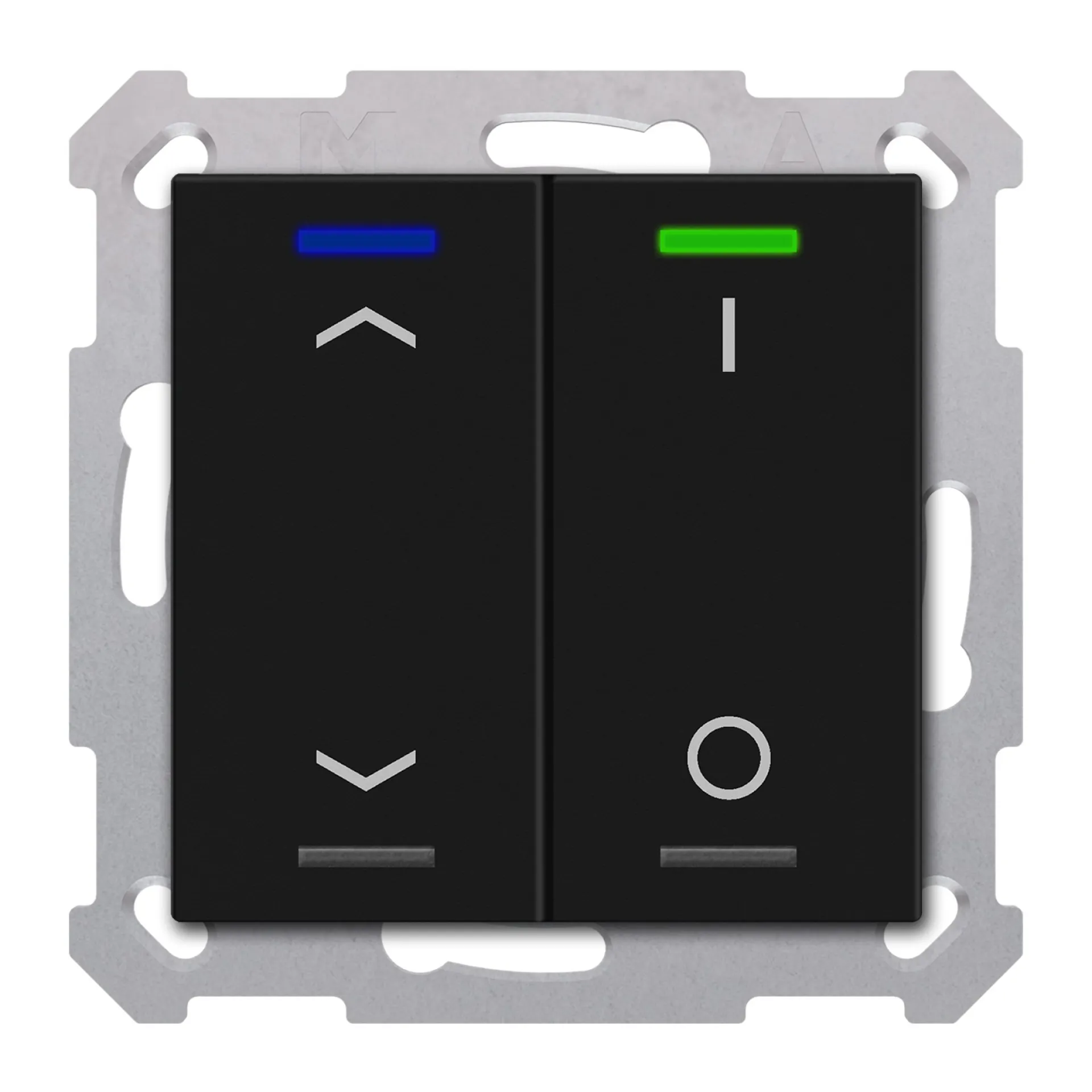 Der 2-fach Taster überzeugt durch sein zeitloses, matt-schwarzes Design (ähnlich RAL 9011) und eine hochwertige Oberfläche aus Thermoplast. Die ergonomisch gestalteten Tasten bieten einen klaren Druckpunkt und sind robust für den täglichen Einsatz. So fügt sich der Taster dezent in jede Wohn- oder Arbeitsumgebung ein.