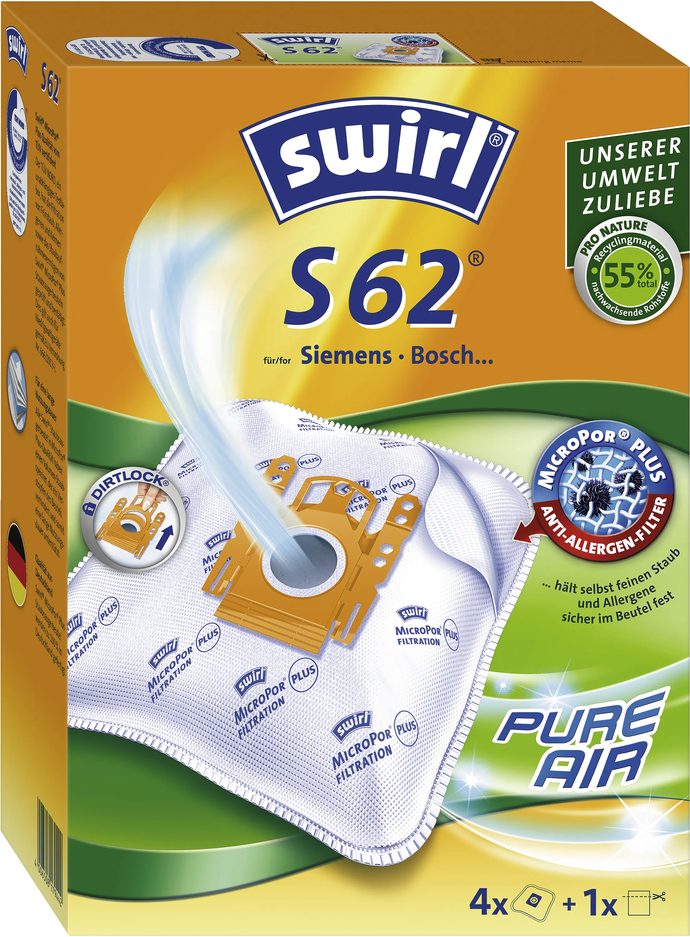 Swirl S 62 Staubsaugerbeutel MicroPor Plus Green, 4er Pack, für Siemens Bosch