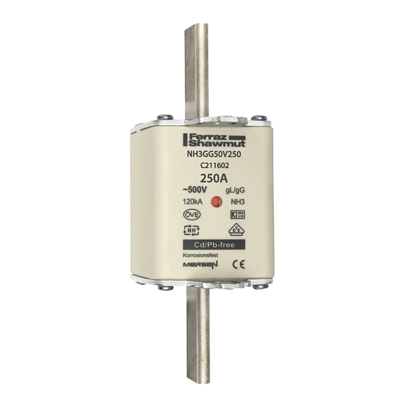 Der Mersen NH3GG50V250 verbindet ausgezeichnete Schutzeigenschaften mit langlebigen Materialien. Durch die verlustarme Konstruktion (max. 21,1 Watt bei Nennstrom) bleibt Ihr System effizient und betriebswirtschaftlich optimal geschützt. Keramischer Korpus und robuste Grifflaschen sorgen für thermische Stabilität, auch bei hoher Dauerbelastung oder extremen Kurzschlüssen.
