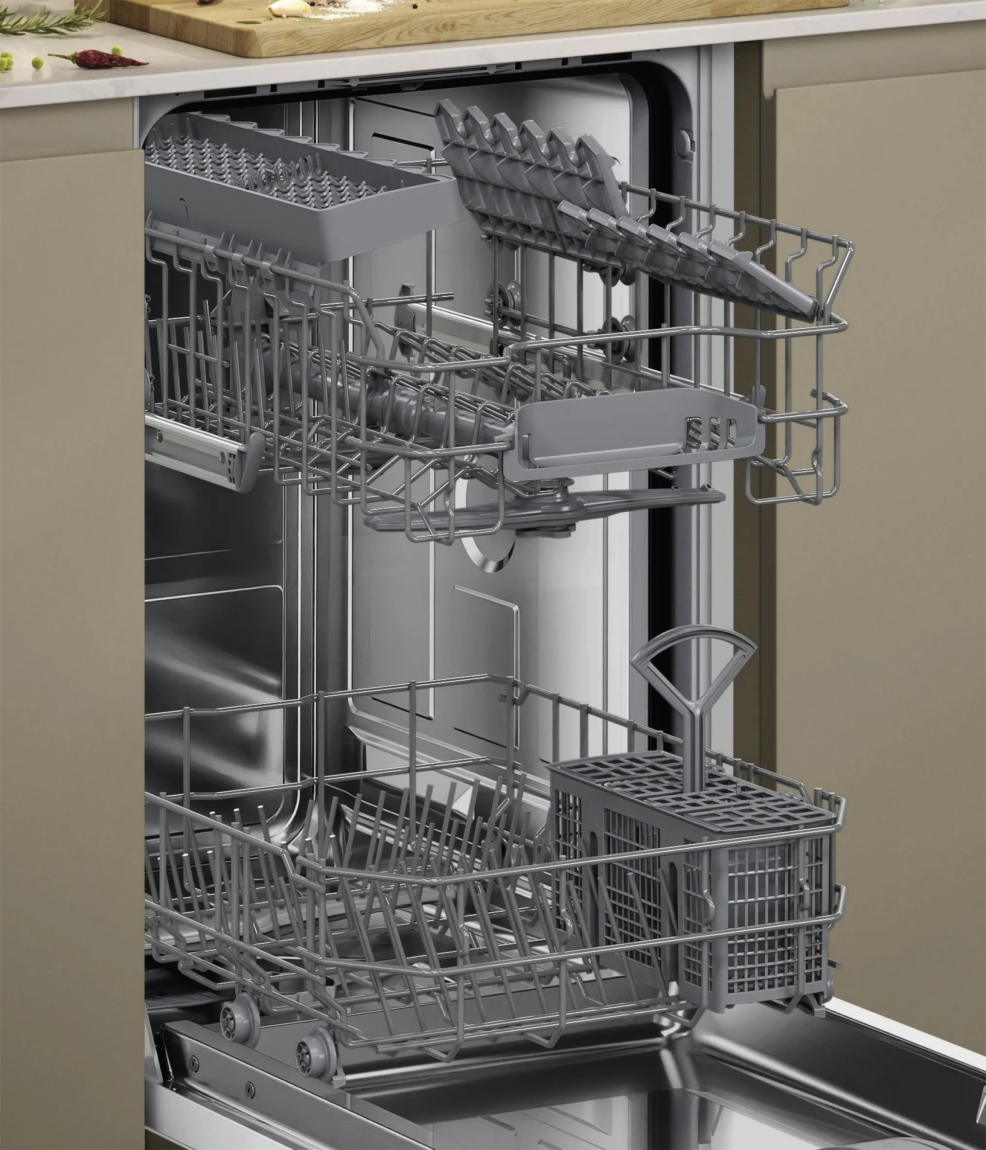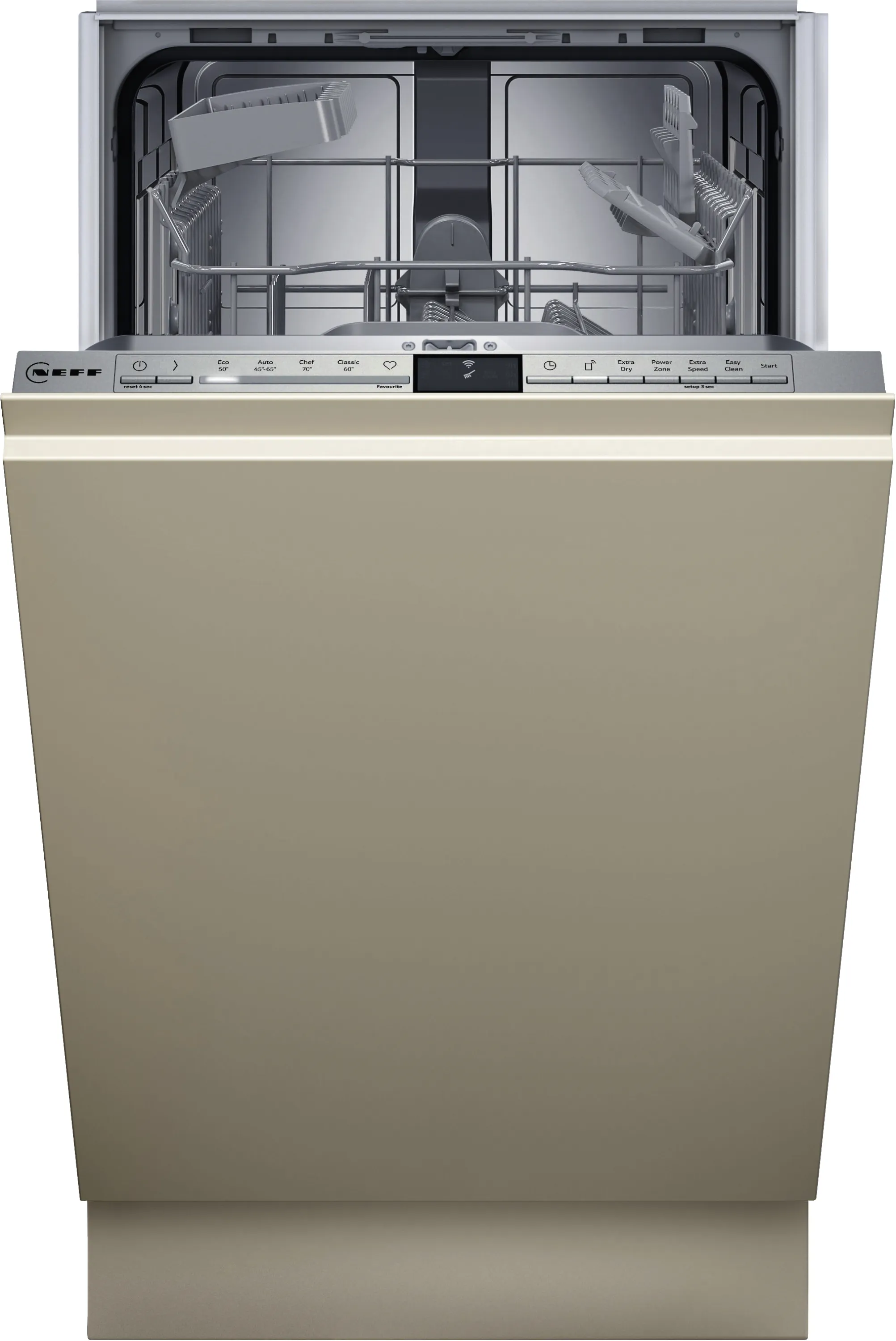 Der vollintegrierbare NEFF S853HKX14E Geschirrspüler überzeugt mit moderner Spültechnologie, effizienter Reinigung und smarter Steuerung. Mit nur 45 cm Breite passt er perfekt in kleine und mittlere Küchen und integriert sich dank vollverkleideter Front nahtlos in jedes Küchendesign.