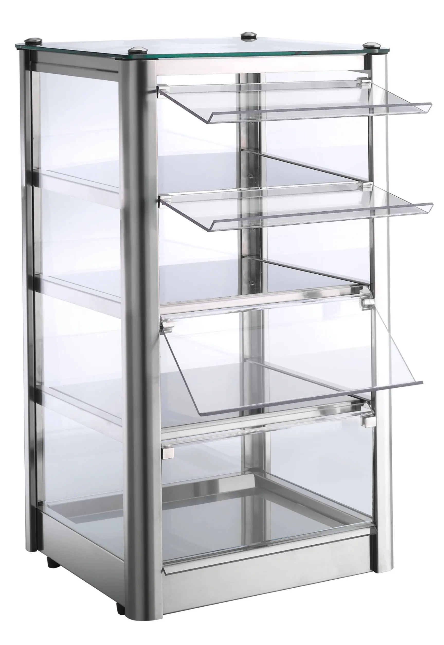 Mit ihrer robusten Konstruktion aus poliertem Edelstahl sowie gehärtetem Glas ist die Cube 4 Warmhaltevitrine ein langlebiger und hygienischer Blickfang in jedem Verkaufsraum. Dank praktischer Türen auf Vorder- und Rückseite ermöglicht sie eine komfortable Selbstbedienung – flexibel für Personal und Kunden. Die großzügigen, beheizten Ebenen sorgen für konstante Temperaturen zwischen 30 °C und 90 °C – optimal zum Warmhalten verschiedenster Backwaren und Snacks.