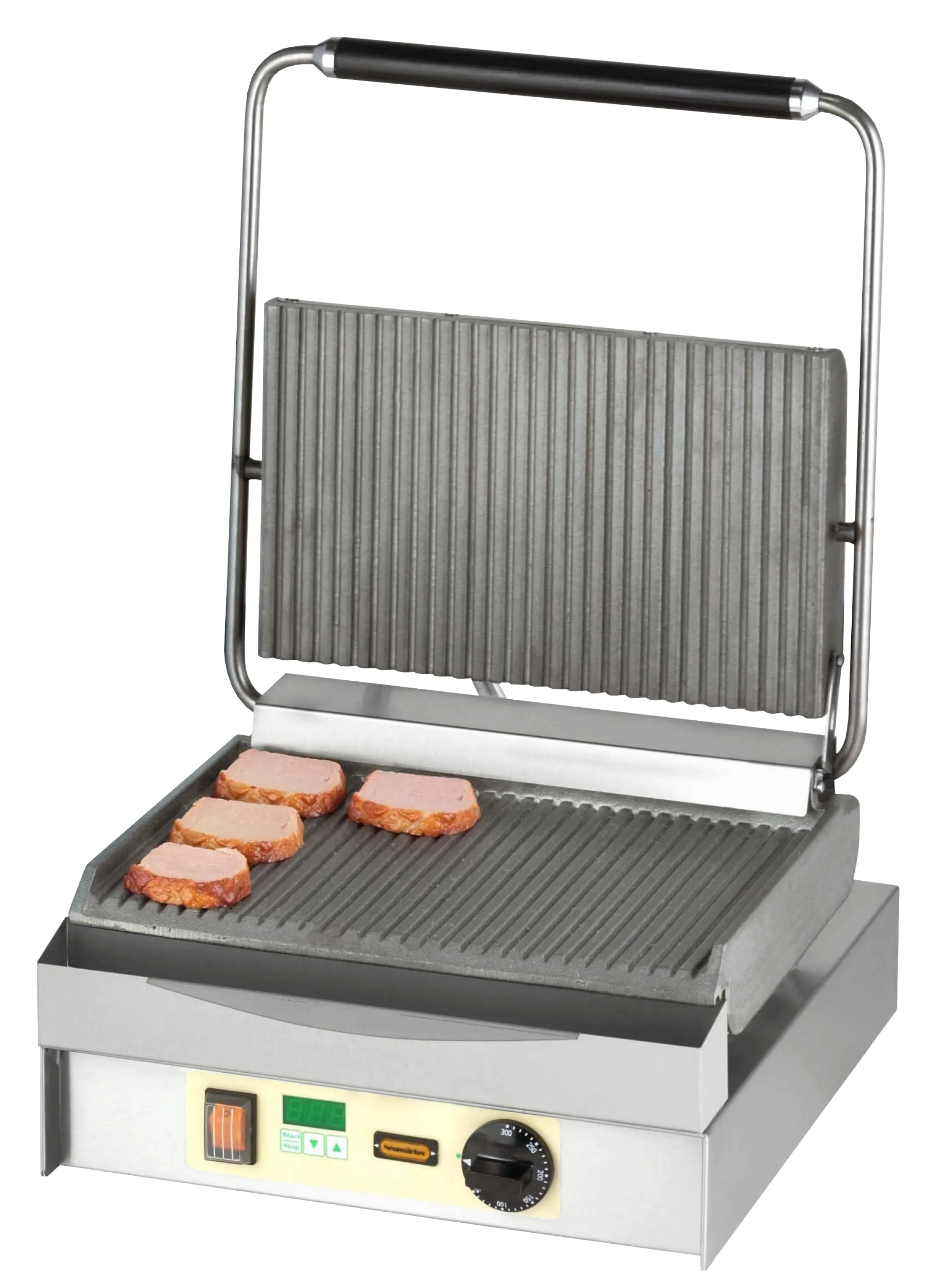 Der Neumärker Chopper-Grill oben & unten geriffelt mit Digitaltimer ist die perfekte Lösung für professionelle Küchen, Imbisse oder Snackbars, die Wert auf schnelle und gleichmäßige Zubereitung legen. Dank robuster Grauguss-Grillplatten erhalten Ihre Gerichte ein attraktives Grillmuster und ein exzellentes Aroma – ideal für vielseitige Grillanwendungen im Alltag.