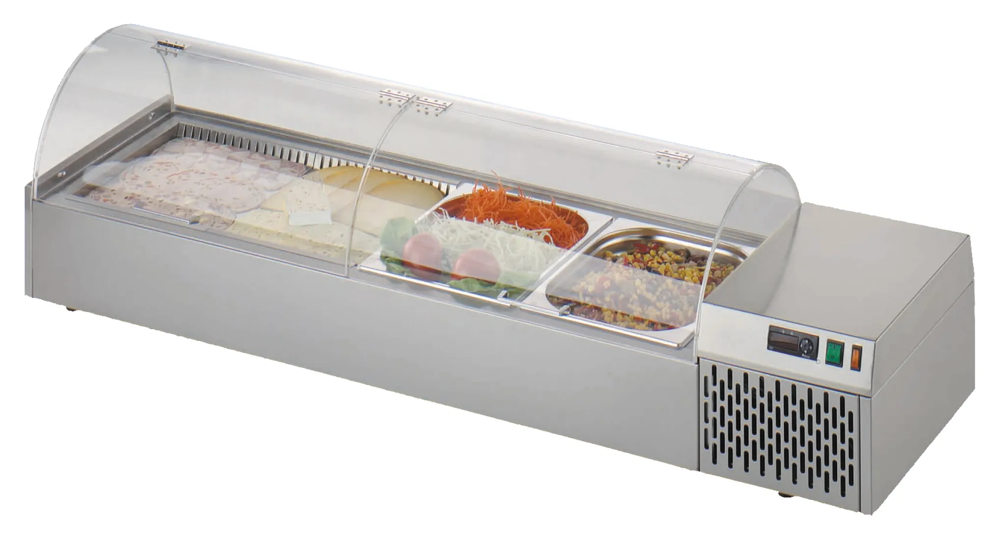 Mit Platz für zwei 1/1 GN-Behälter (bis zu 100 mm tief, nicht im Lieferumfang enthalten) ermöglicht diese Kühlvitrine eine flexible und übersichtliche Anordnung von Speisen. Der hochwertige Acrylglasdeckel schützt die Auslage vor äußeren Einflüssen und hält Ihre Produkte stets auf optimaler Temperatur.
