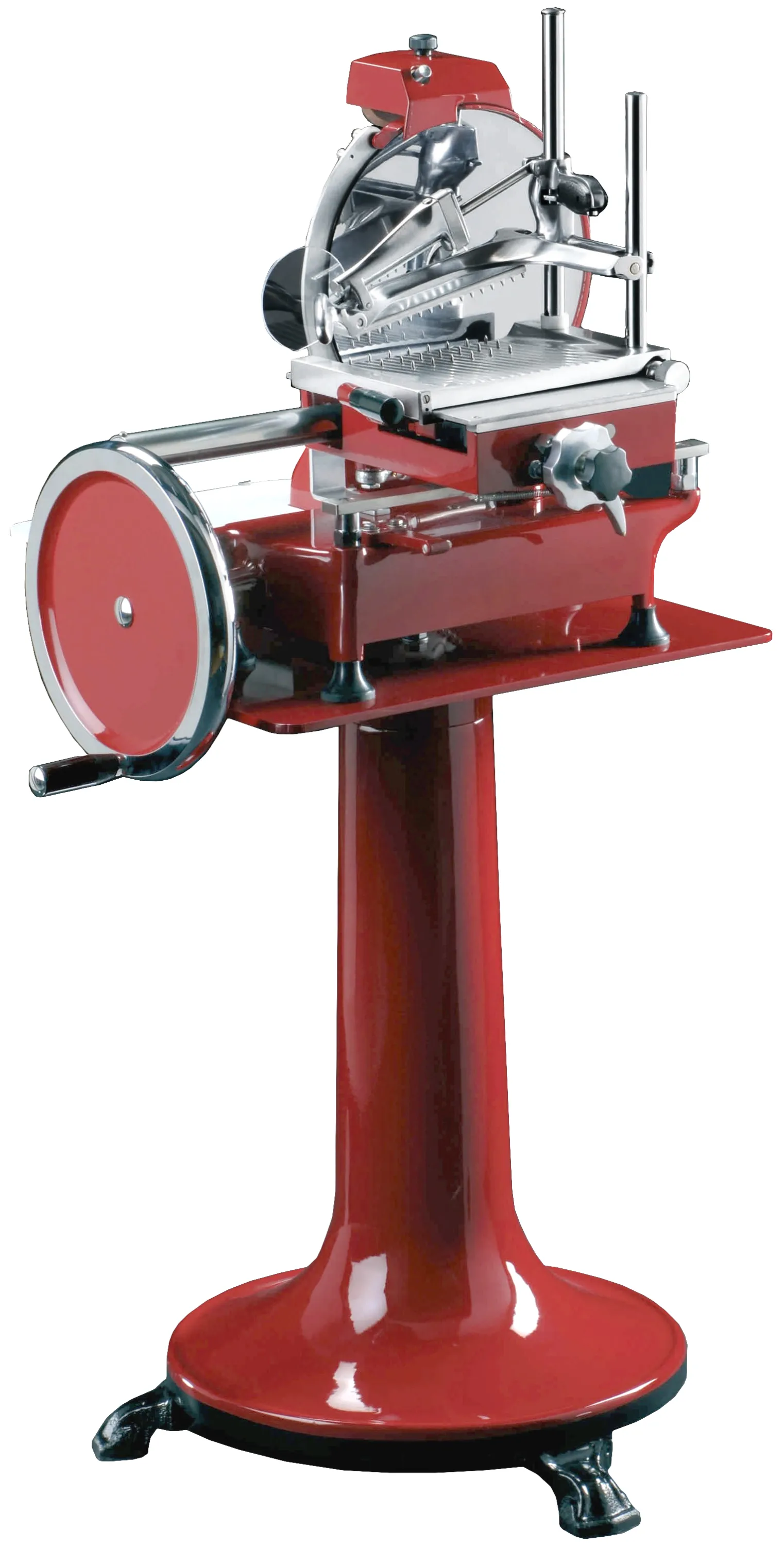 Das stabile Gehäuse aus Aluminium mit verstärkten Stahlteilen sorgt für eine exzellente Standfestigkeit und dauerhafte Belastbarkeit im täglichen Einsatz. Die intensive Rotlackierung macht die Maschine zu einem echten Blickfang in jeder professionellen Umgebung und schützt zuverlässig vor äußeren Einflüssen. Mit einem hochpräzisen 300-mm-Messer lassen sich selbst größere Fleischstücke bis zu einer Scheibenlänge von 230 mm und einer Höhe von 190 mm mühelos verarbeiten.